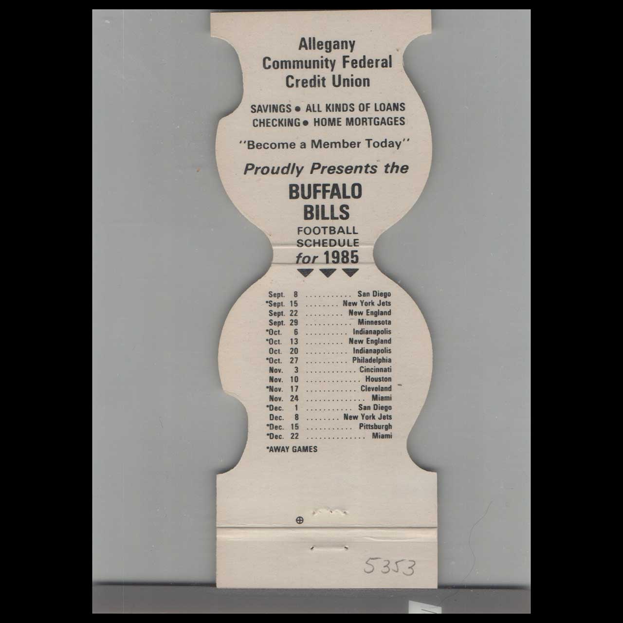 Allegany Community Federal Credit Union matchbook from 1985 featuring the Buffalo Bills schedule. A nostalgic piece of Americana for collectors.