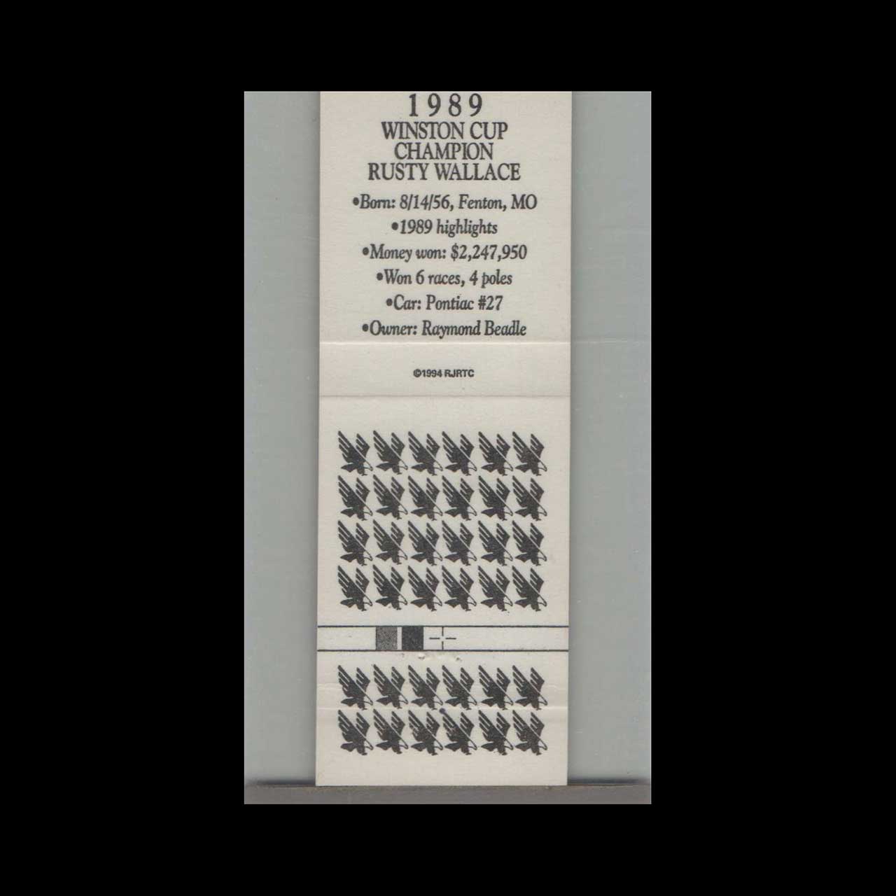 1989 Rusty Wallace NASCAR Winston Cup Matchbook Cover