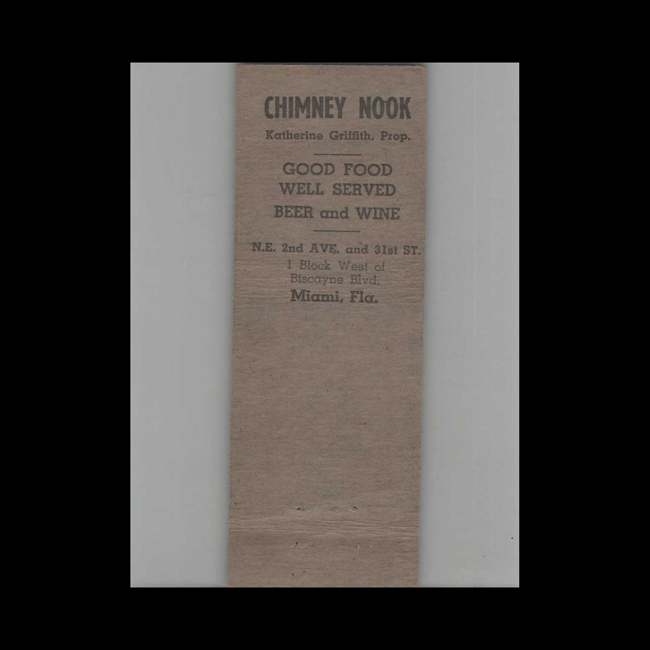 Advance Match Co. Chimney Nook Miami FL Matchbook Cover