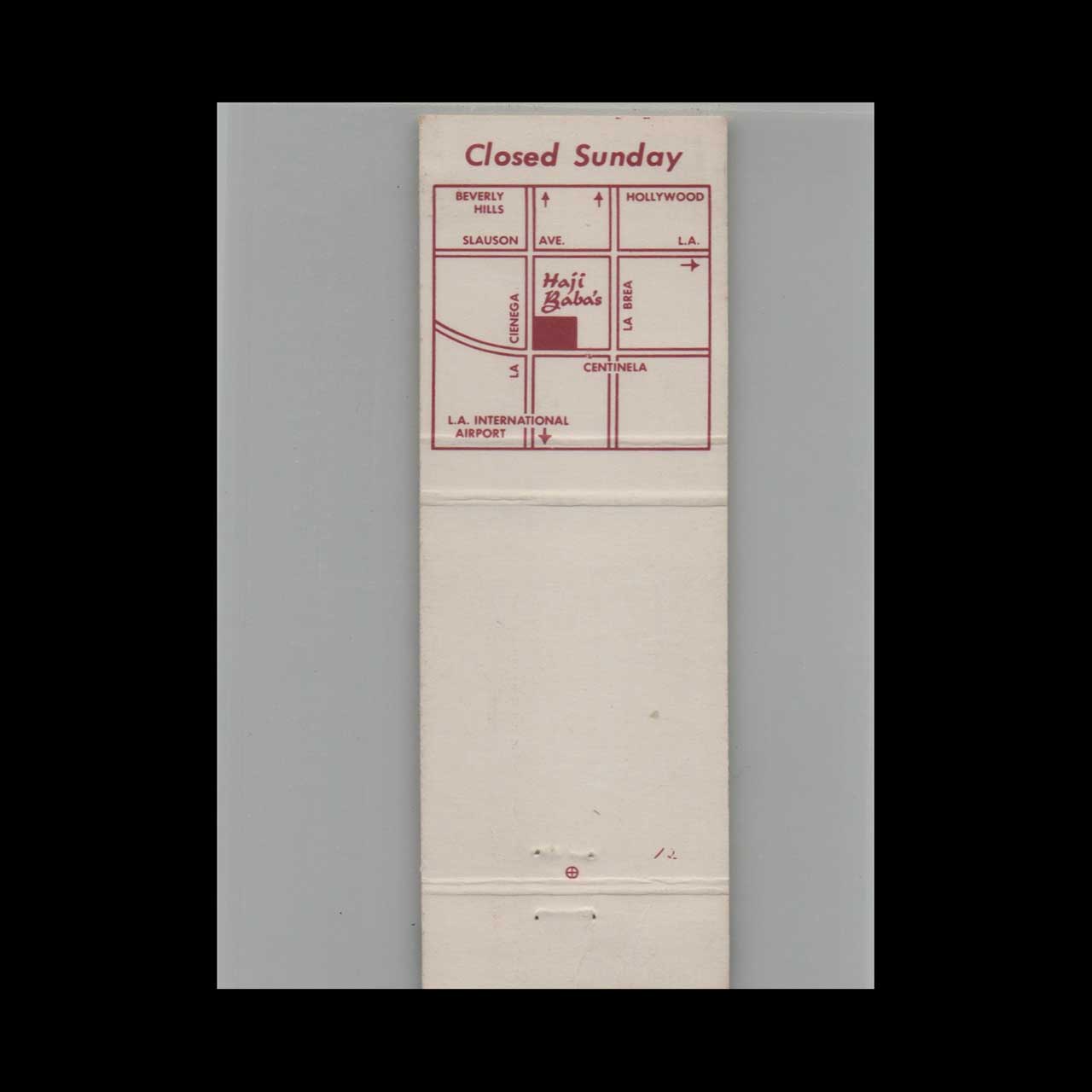 Aji Baba’s Restaurant in Inglewood, CA, offered authentic Middle Eastern cuisine in a vibrant mid-century setting. This matchbook is a nostalgic piece of Americana for collectors and vintage ephemera enthusiasts.