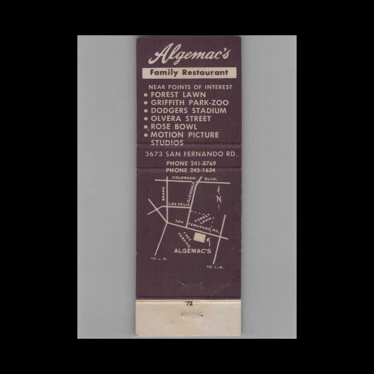 Al Ge Mac’s Restaurant Matchbook Cover Glendale CA