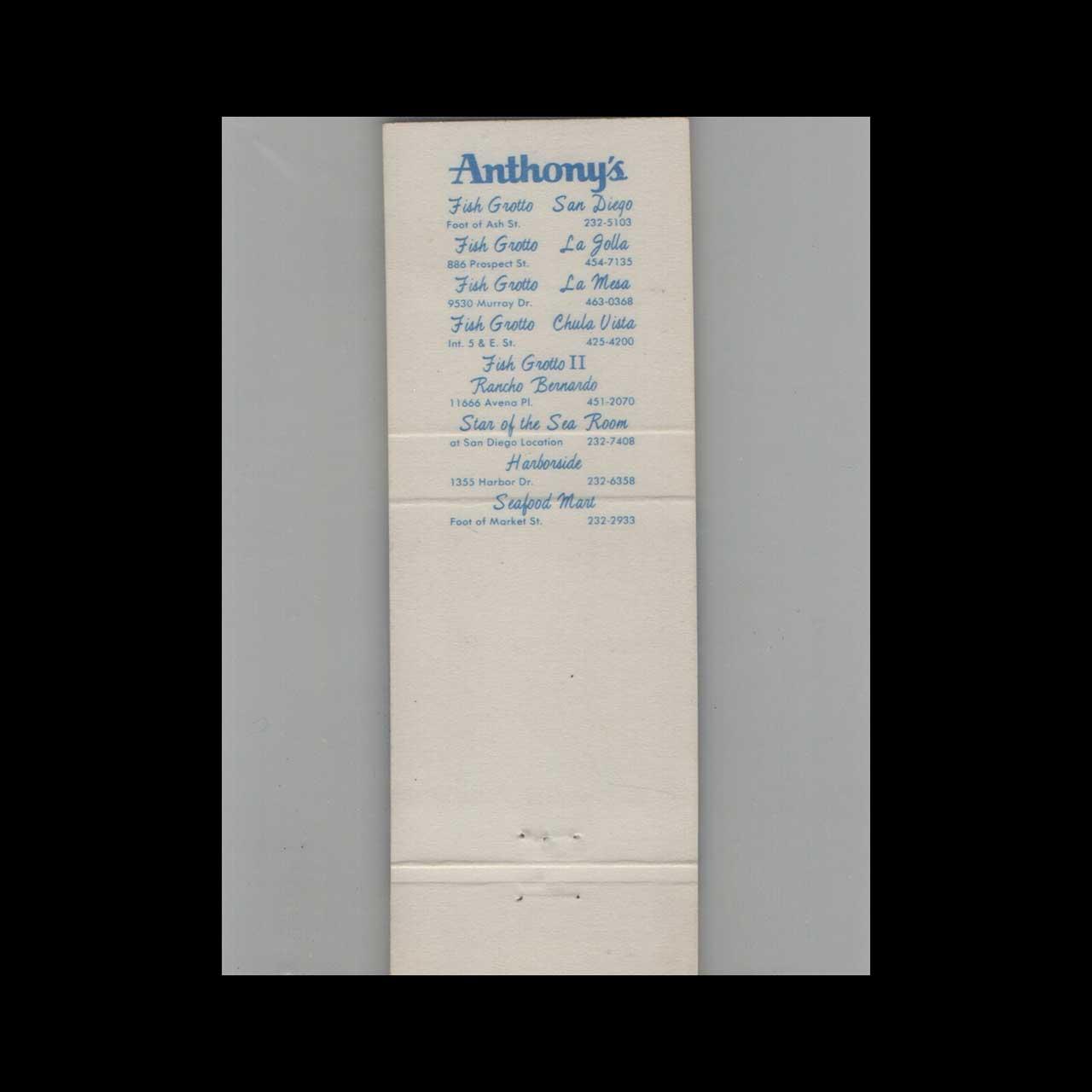 Anthony’s Fish Grottos Matchbook Cover San Diego