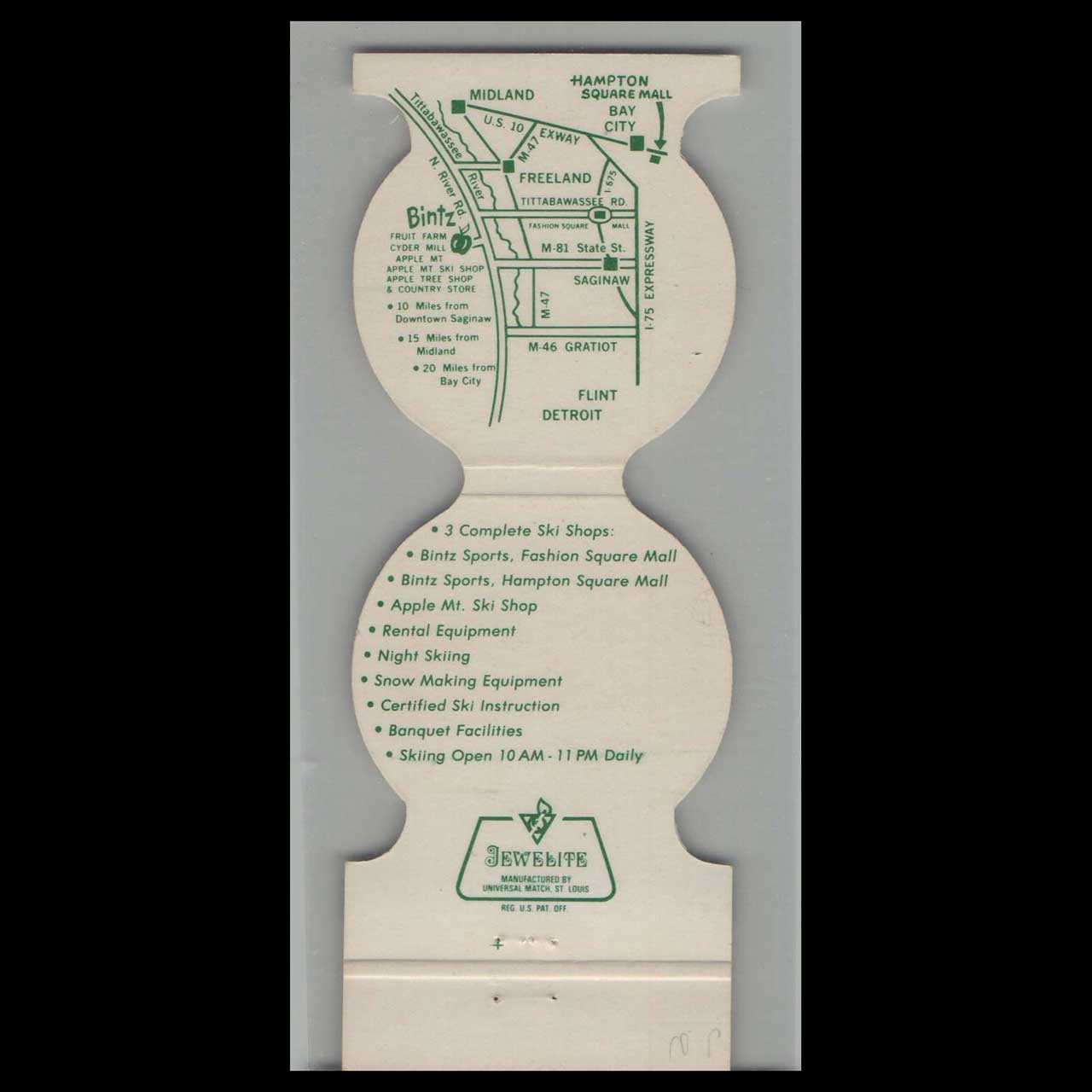 Apple Mountain Steak House in Freeland, MI, offered hearty American dining in a rustic mountain setting. This die-cut matchbook is a nostalgic piece of Americana for collectors.