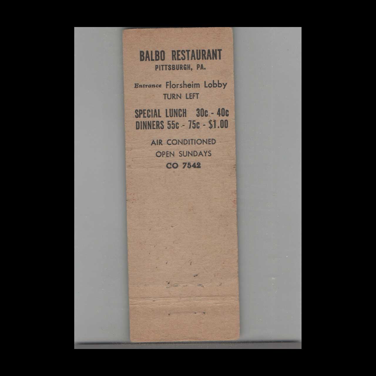 Balbo Italian Restaurant Matchbook Cover 444 Wood St