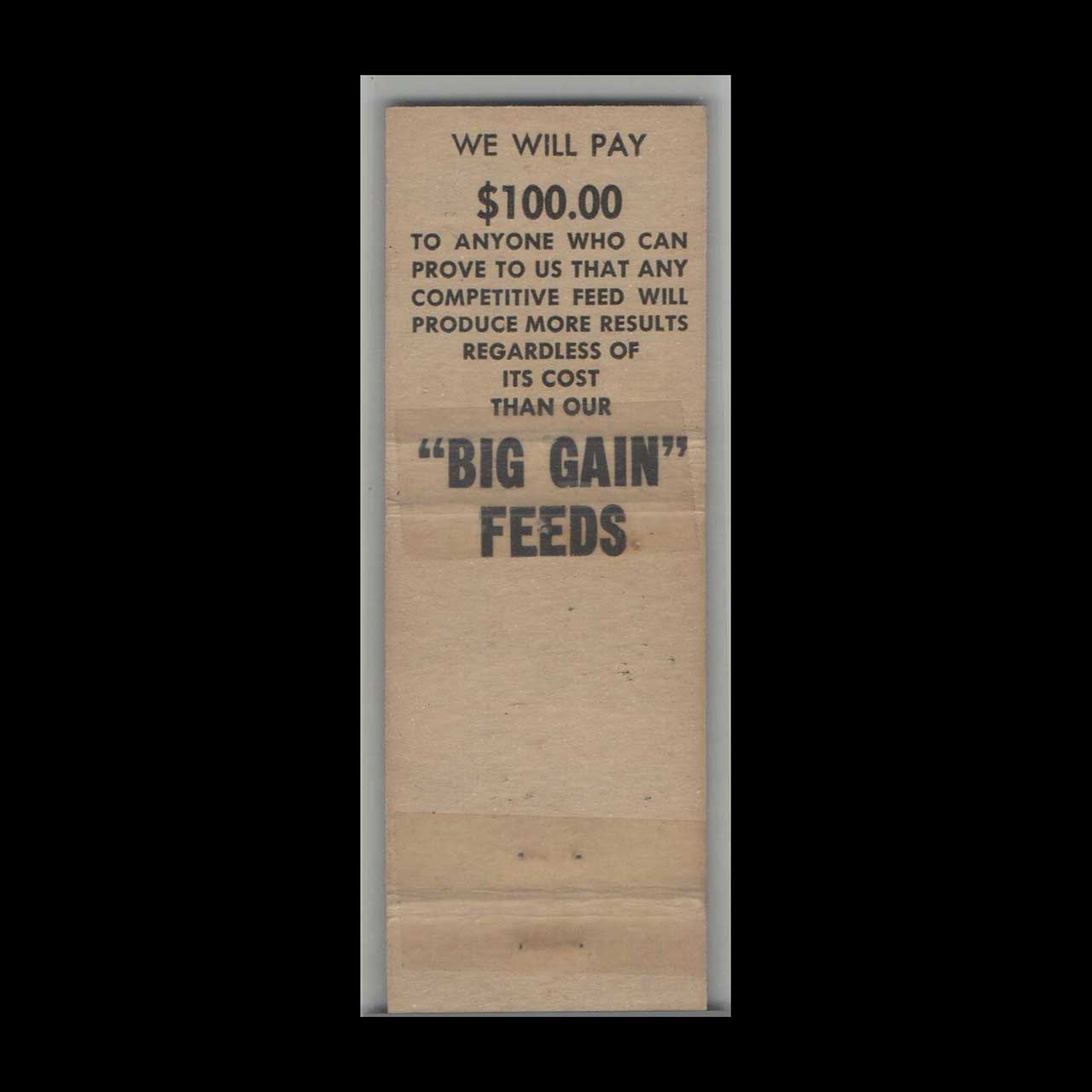 Big Gain Feeds Matchbook Cover West Union IA & Mankato MN