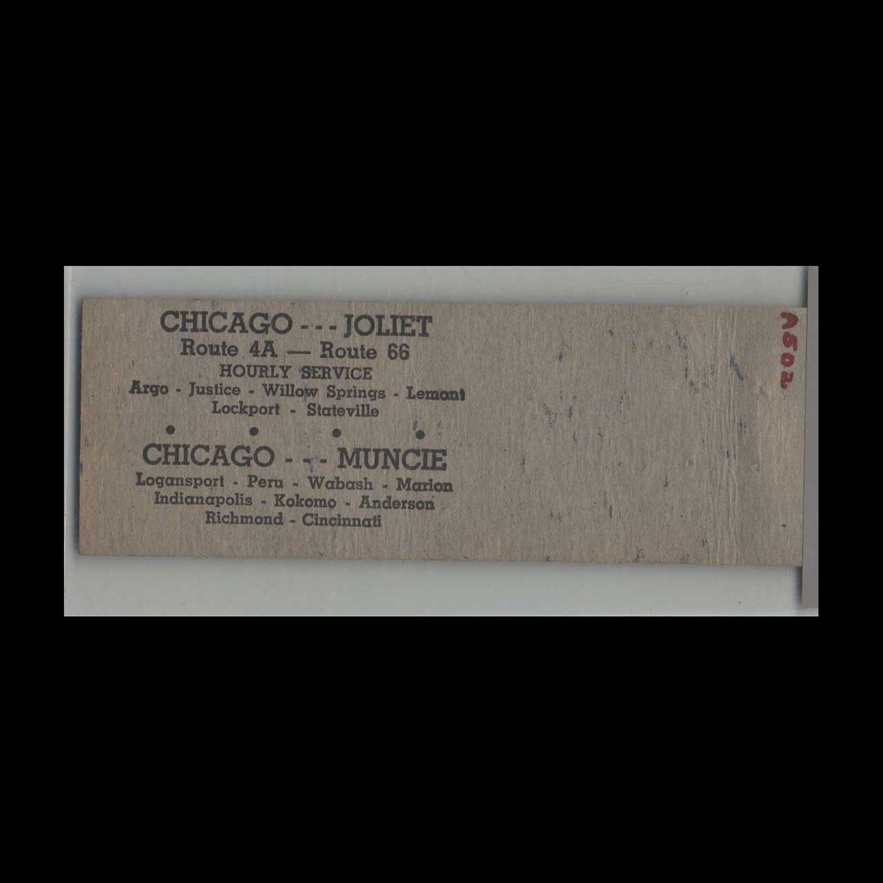 Bluebird System Bus Line connected Chicago and Joliet, offering reliable regional transportation. A nostalgic piece of Americana for vintage matchbook collectors.