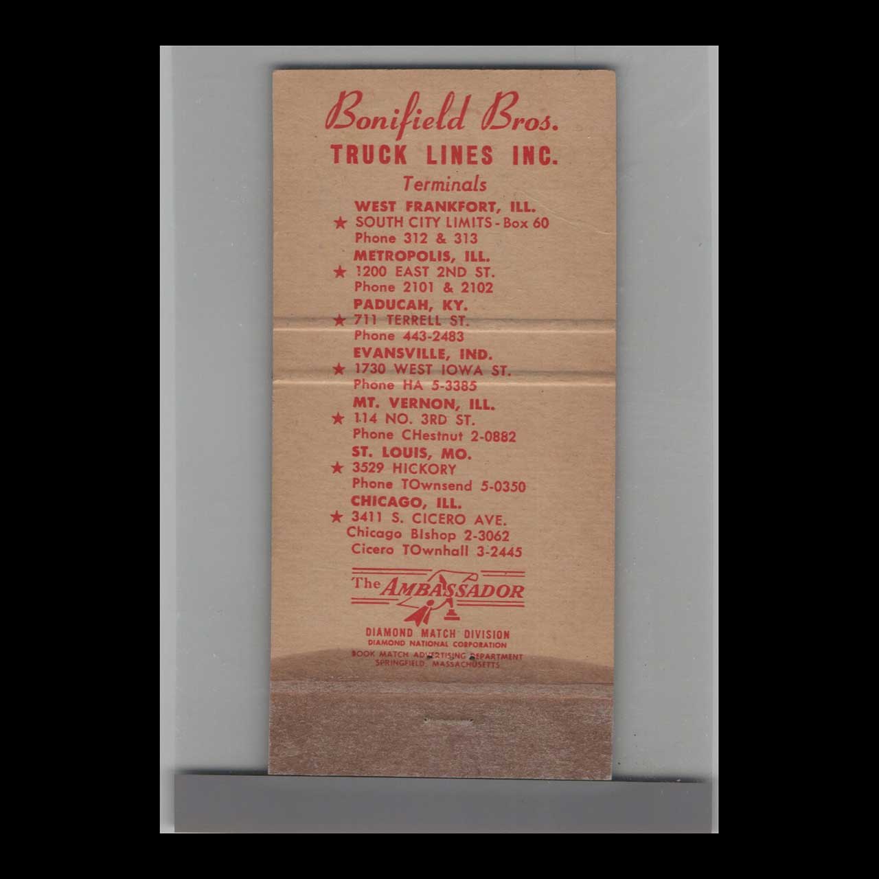 Bonifield Bros Truck Lines of West Frankfort, IL, exemplifies mid-20th-century American trucking heritage. This vintage matchbook is a classic ephemera relic cherished by collectors.
