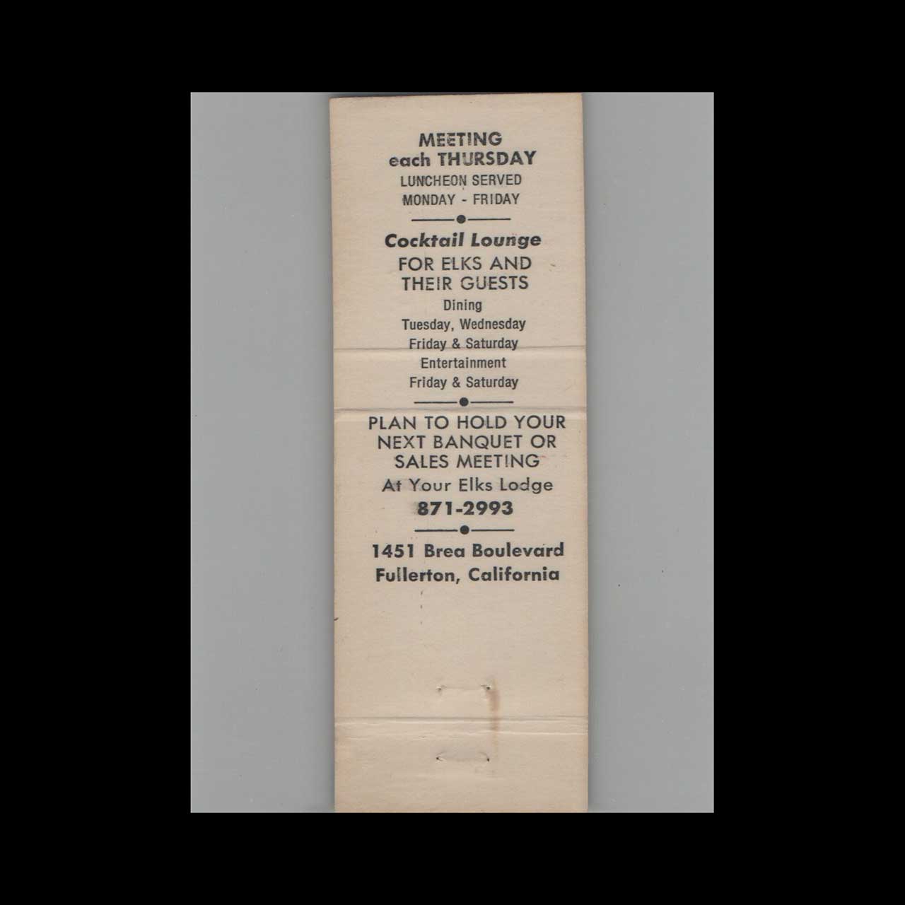 BPOE Elks Club 1993 Matchbook Cover Fullerton CA