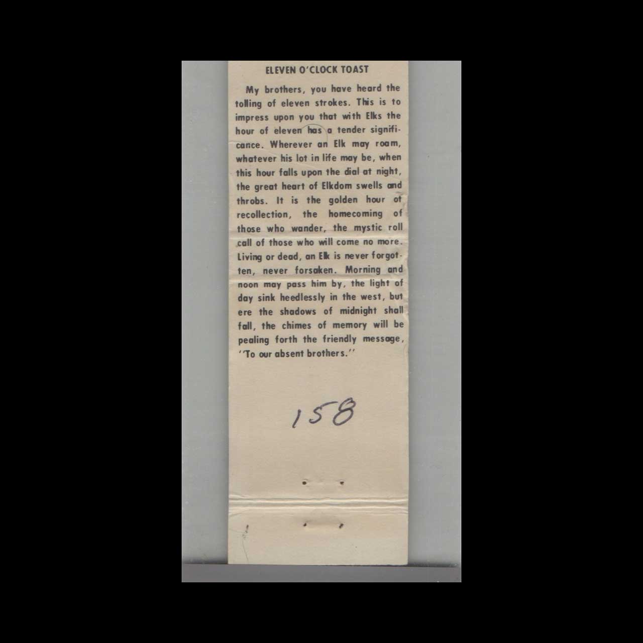 Home / Organizations & Institutions / Fraternal & Social Orgs / Elks / BPOE Elks Lodge #158 Springfield IL Matchbook Cover