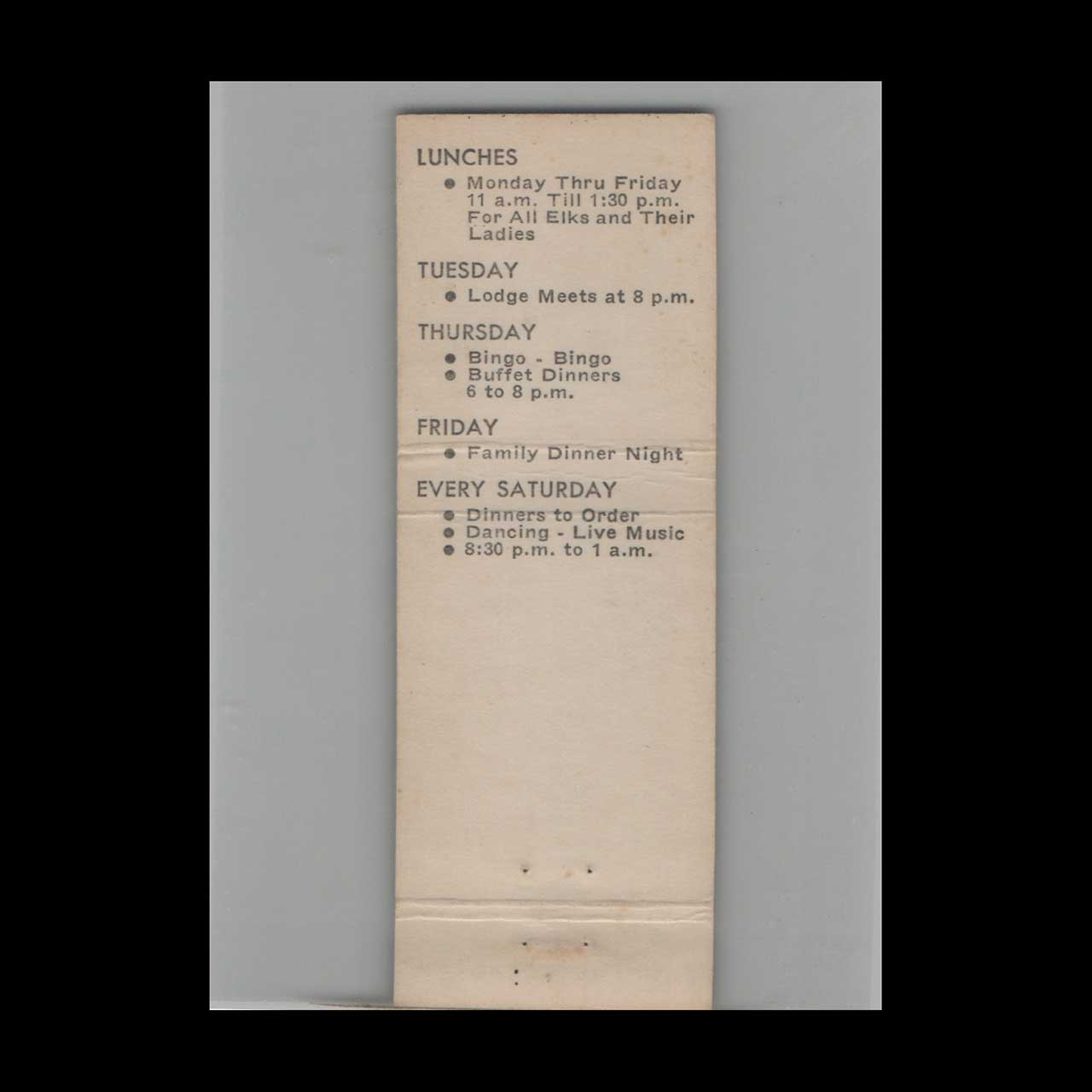 Home / Organizations & Institutions / Fraternal & Social Organizations / BPOE Elks / BPOE Elks Lodge #1604 Mt Vernon WA Matchbook Cover