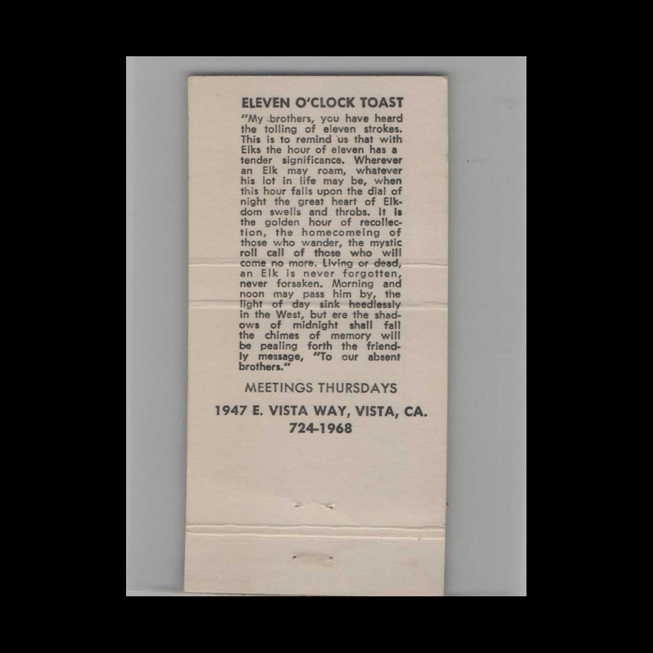 BPOE Elks Lodge 1968 Vista CA Matchbook Cover