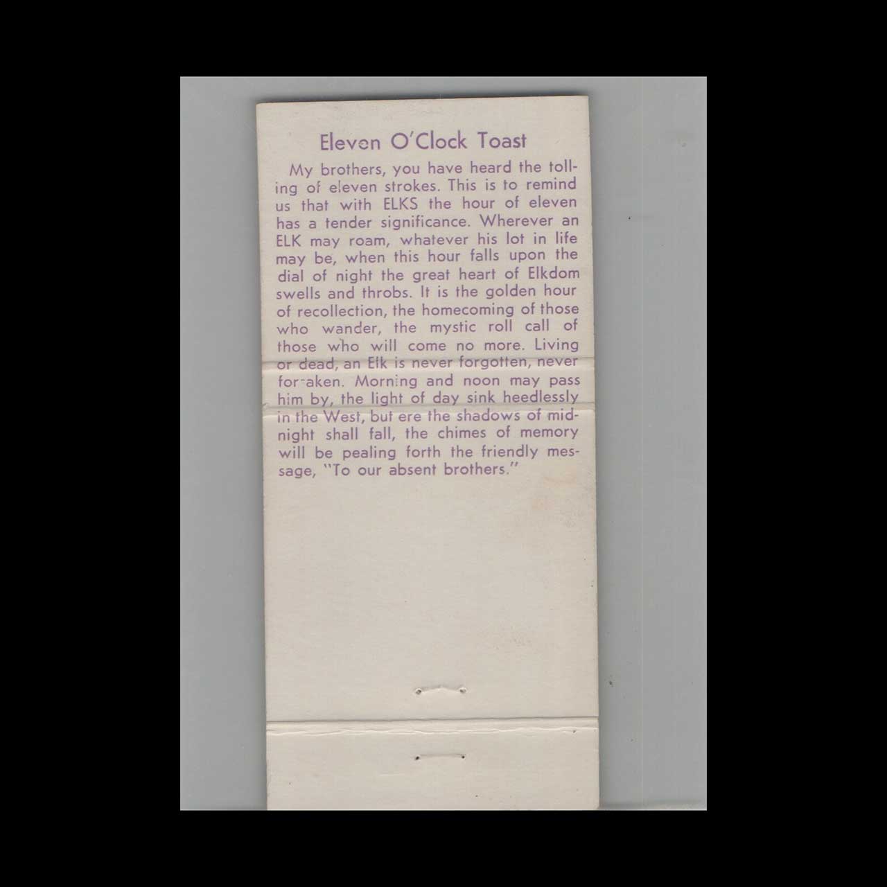 Home / Organizations & Institutions / Fraternal & Social Organizations / BPOE Elks / BPOE Elks Lodge 2050 Playa Del Rey Matchbook Cover