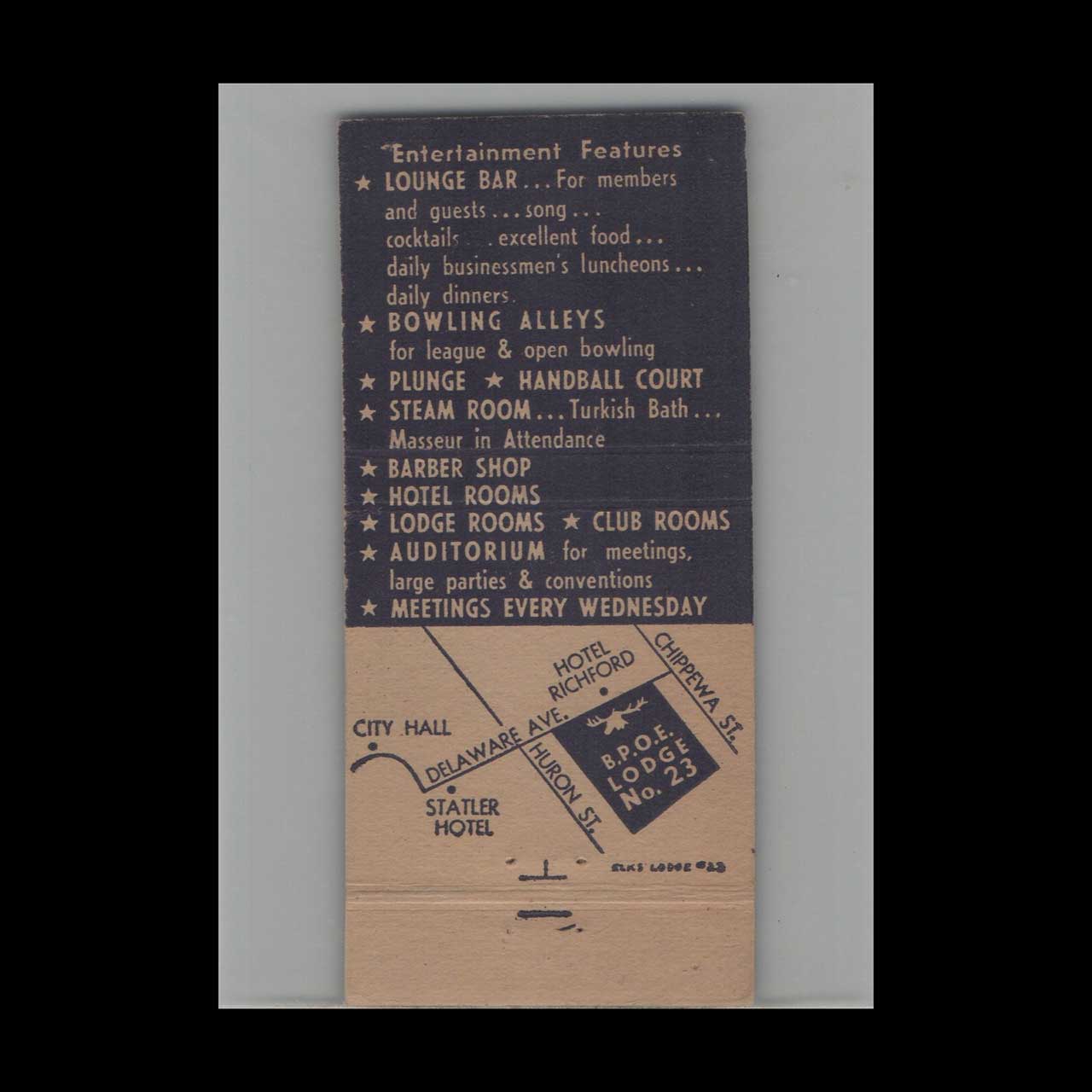 BPOE Elks Lodge 23 Buffalo NY Matchbook Cover
