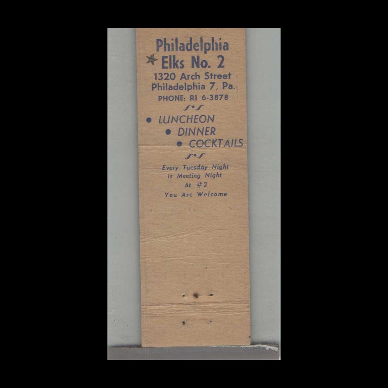 BPOE Elks Lodge No. 2 Philadelphia Matchbook Cover