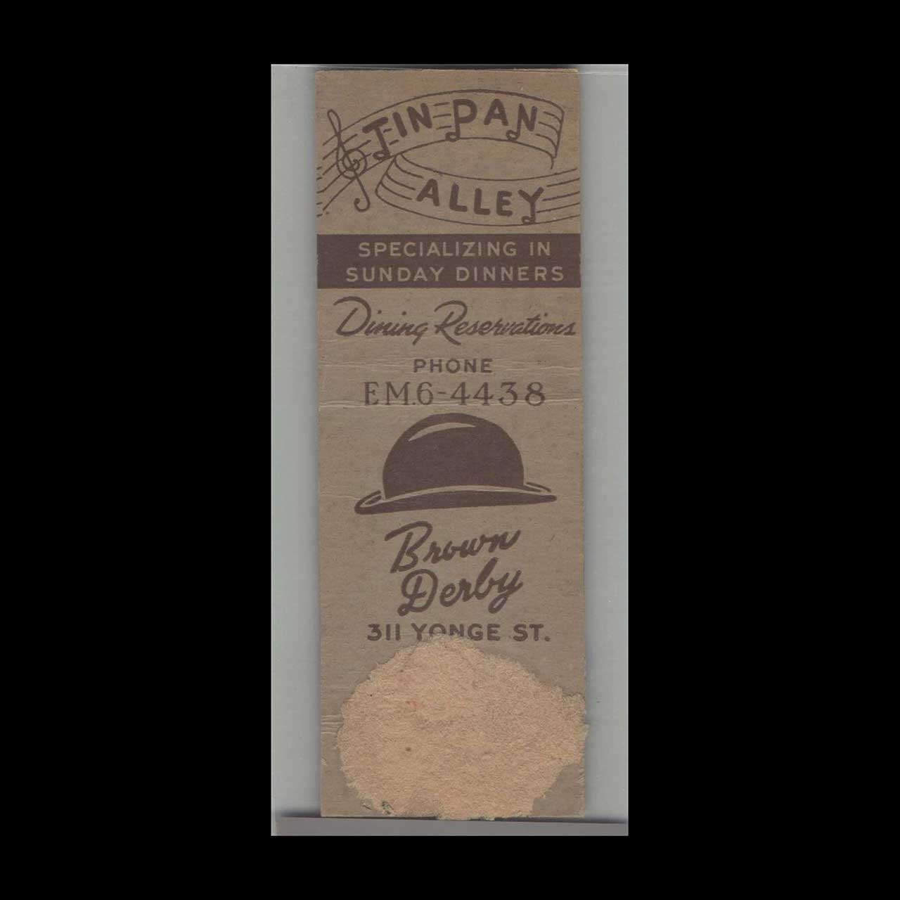 Brown Derby Tavern Toronto Music Matchbook Cover