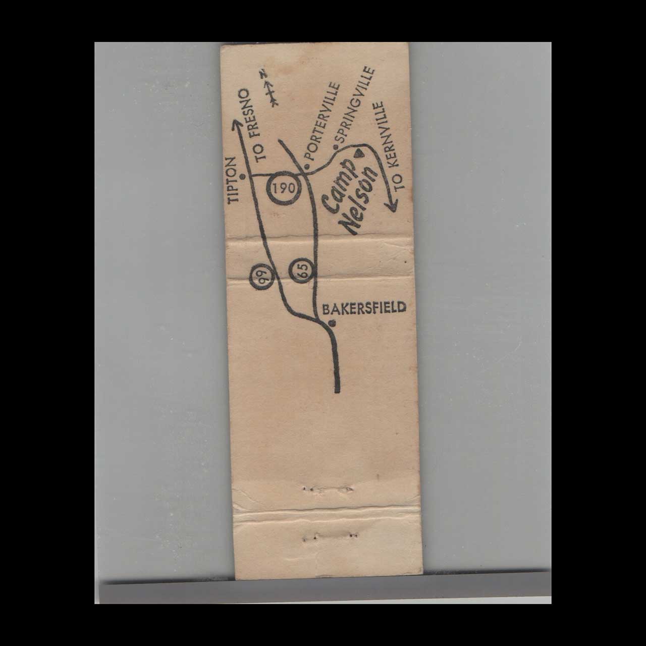 Camp Nelson Resort in Springville, CA, offered rustic mountain lodging and outdoor recreation. A nostalgic piece of Americana for vintage matchbook collectors.