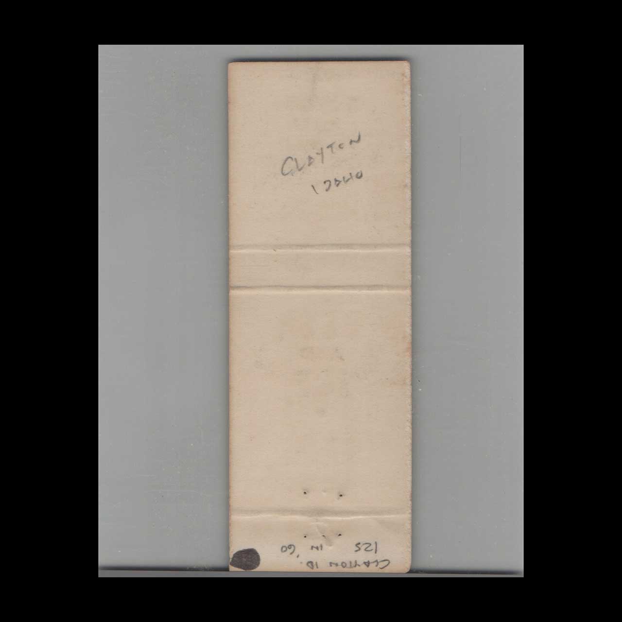 Canyon Grocery in Clayton, ID, offered fishing tackle and groceries to outdoor enthusiasts and locals alike. This matchbook is a classic ephemera relic cherished by Americana collectors.