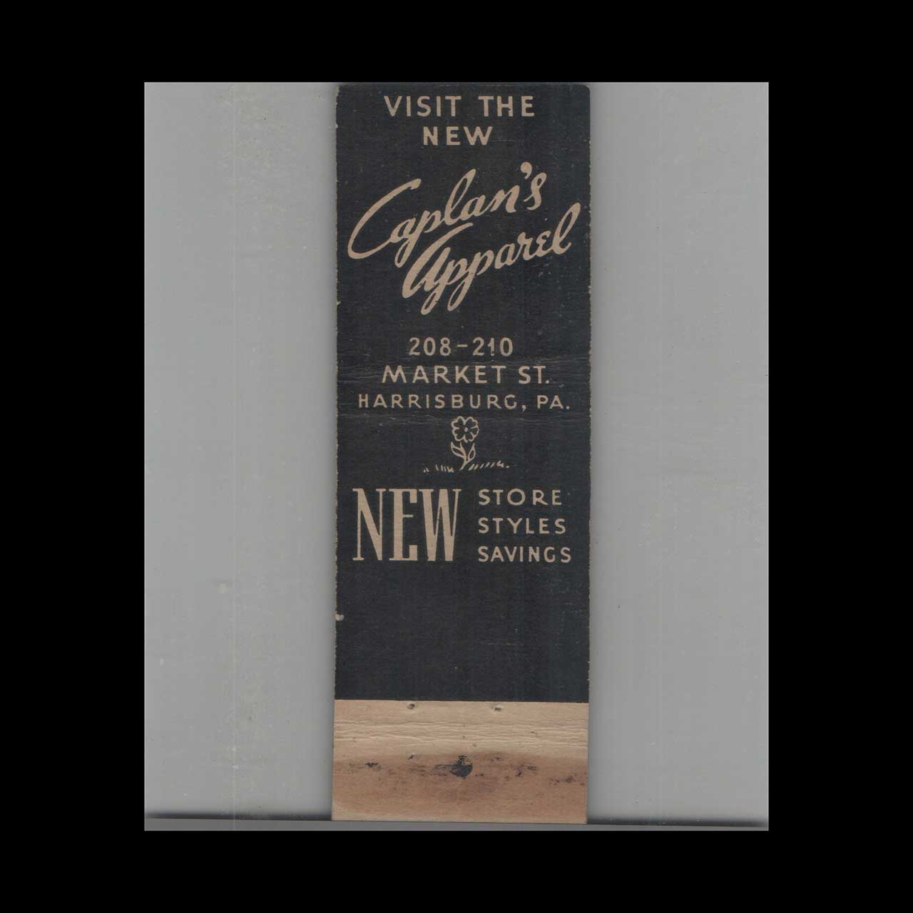 Caplan’s Drug Store in Harrisburg, PA, served the community with trusted pharmaceutical care and local charm. This vintage matchbook is a classic ephemera relic cherished by Americana collectors.