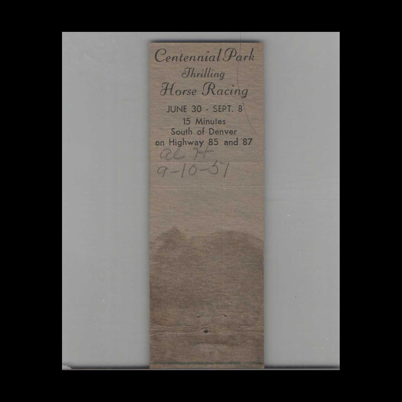 Centennial Park Horse Racing Matchbook Cover South Denver