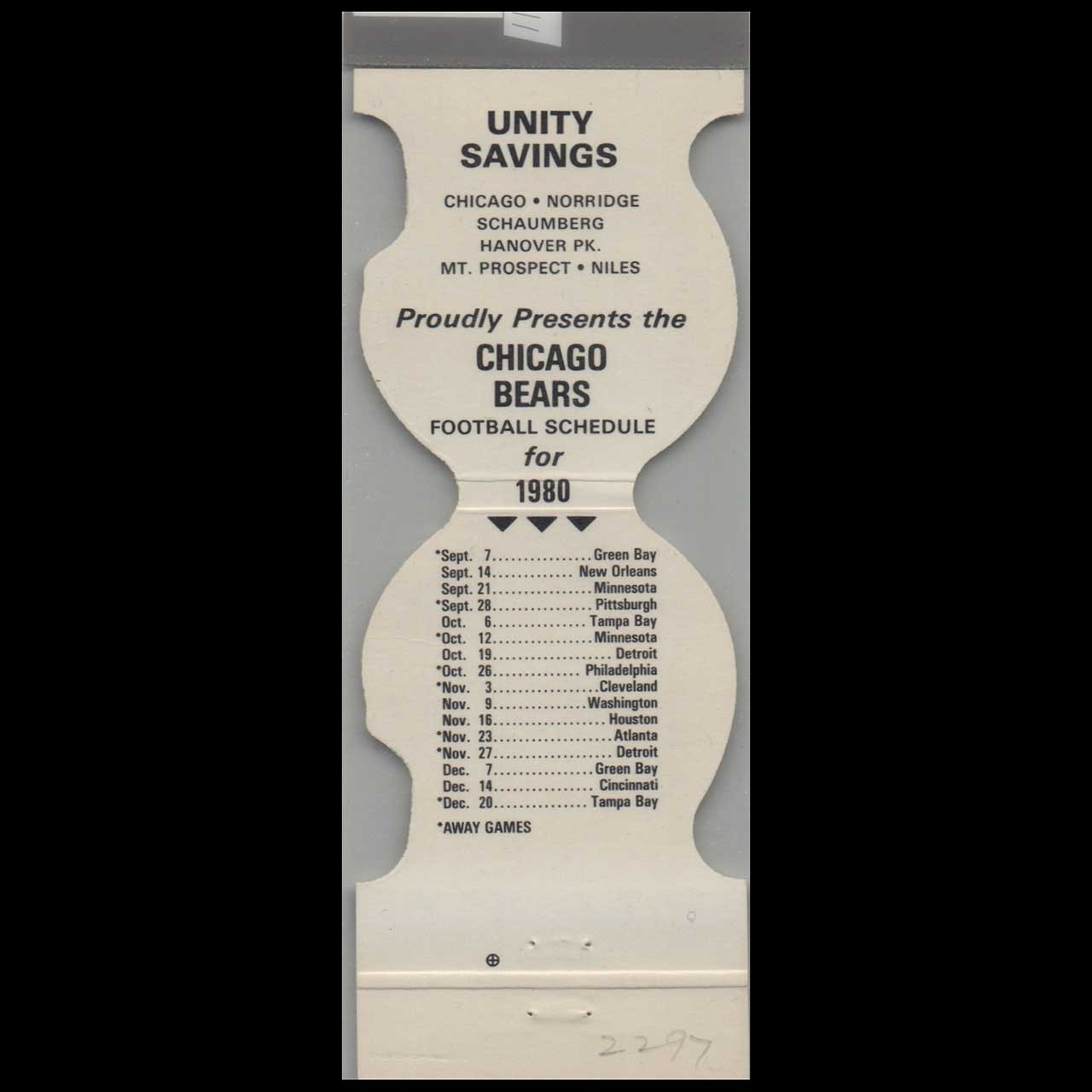 Unity Savings, a trusted financial institution, features the 1980 Chicago Bears football schedule on this vintage matchbook cover. A nostalgic piece of Americana for collectors and sports enthusiasts alike.
