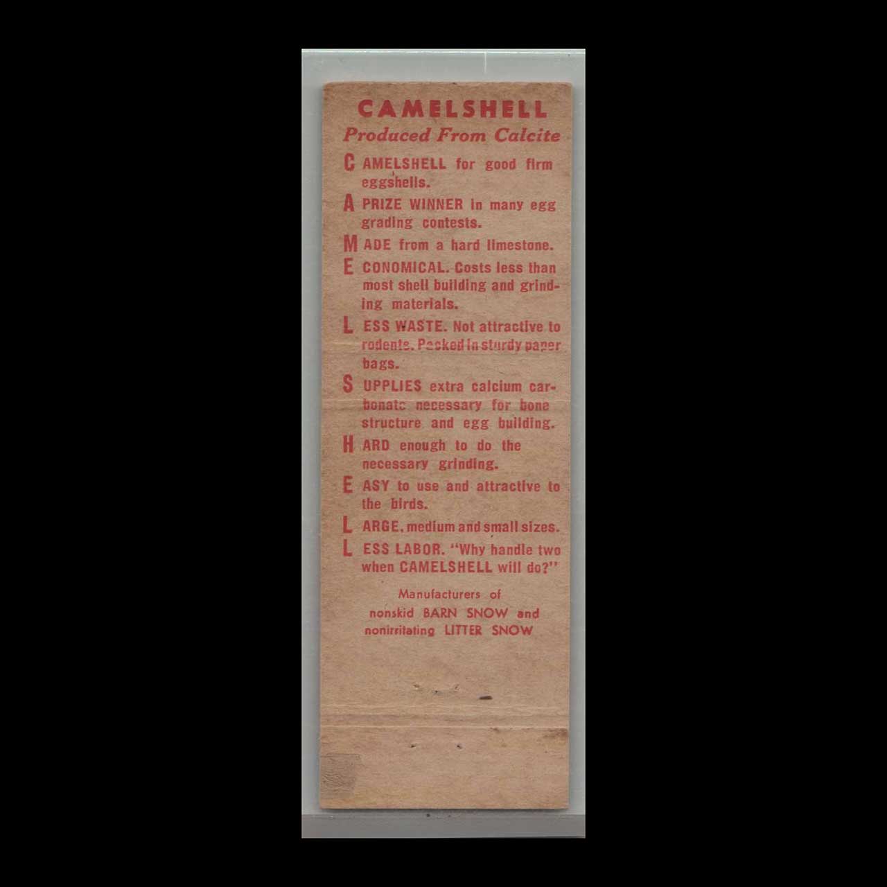 Chicken Camelshell Chicken Feed in Towson, MD, served local farmers with quality poultry feed. A nostalgic piece of Americana for vintage matchbook collectors.