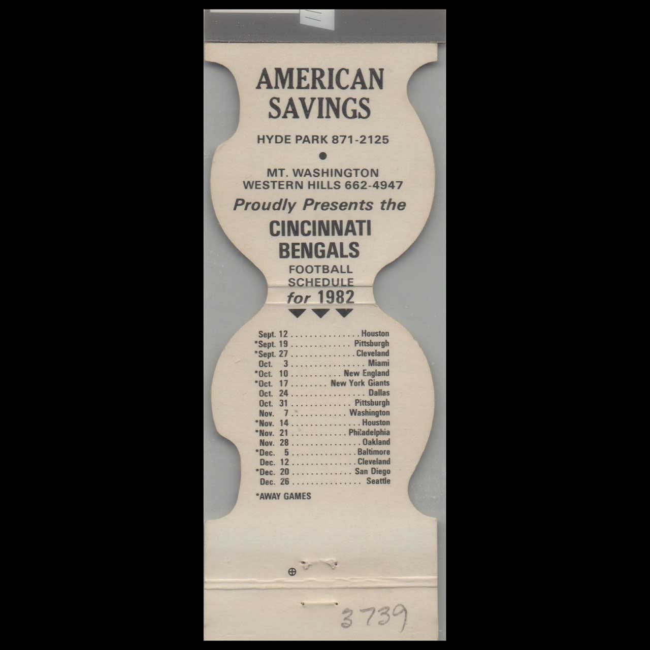 Vintage matchbook from American Savings featuring the 1982 Cincinnati Bengals football schedule. A nostalgic piece of Americana for collectors and sports enthusiasts.
