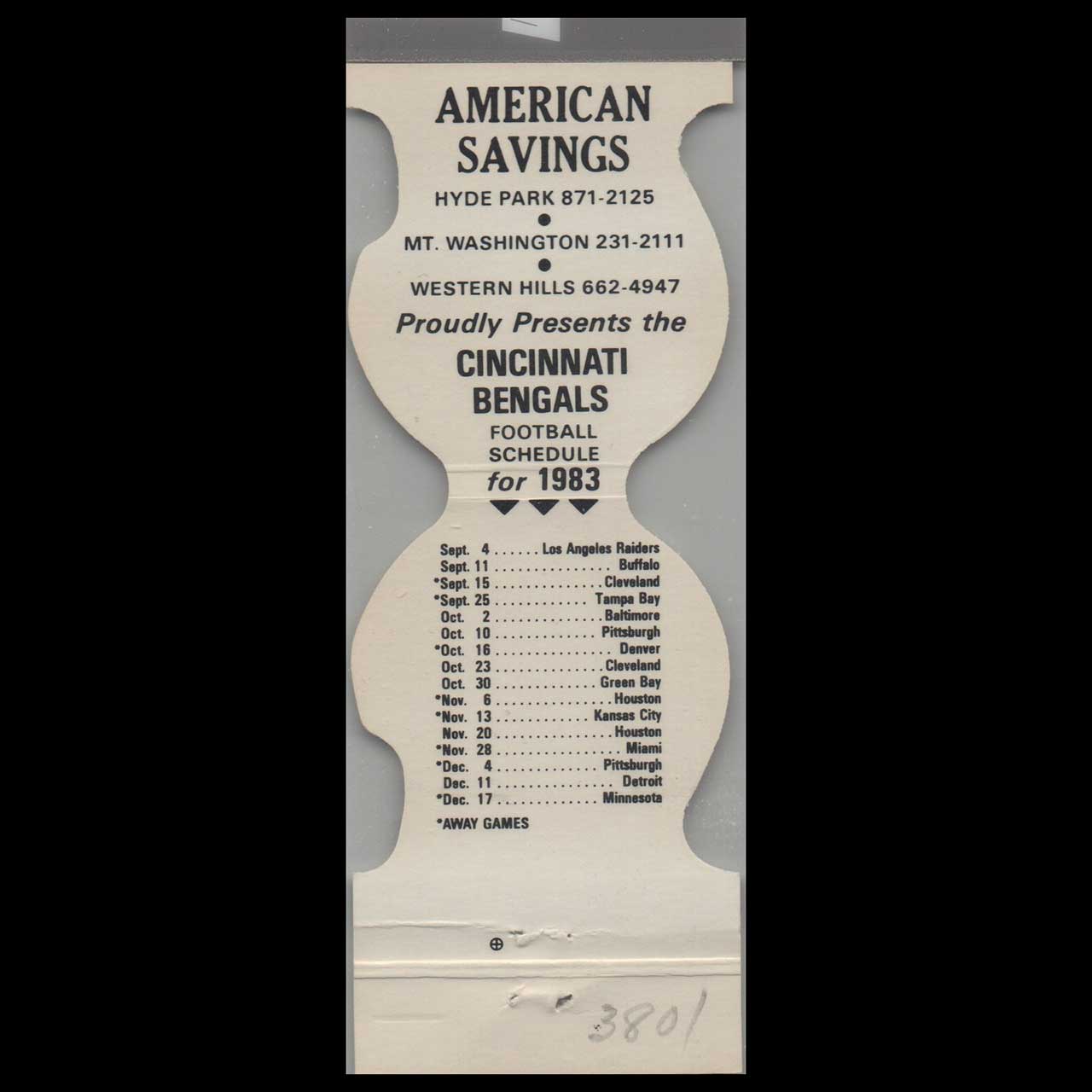 American Savings featured this 1983 Cincinnati Bengals football schedule matchbook cover. A nostalgic piece of Americana for collectors and sports enthusiasts alike.