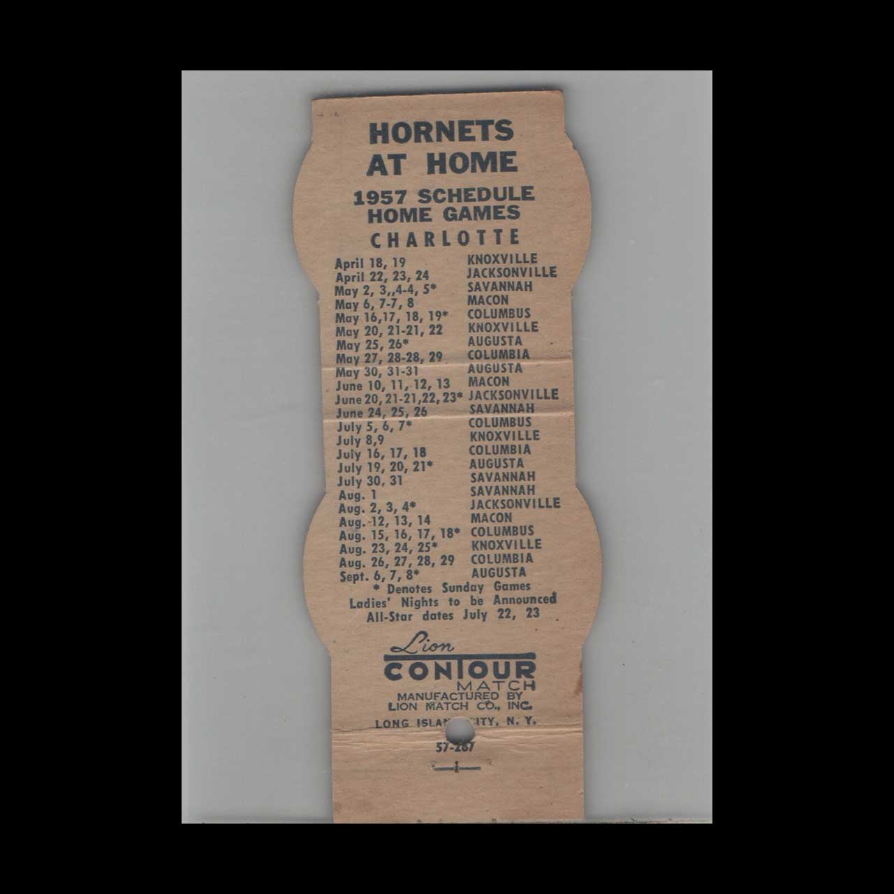 Clark Griffith Park, home of the Charlotte Hornets baseball team, showcases the 1957 season schedule. A nostalgic piece of Americana for vintage matchbook collectors.