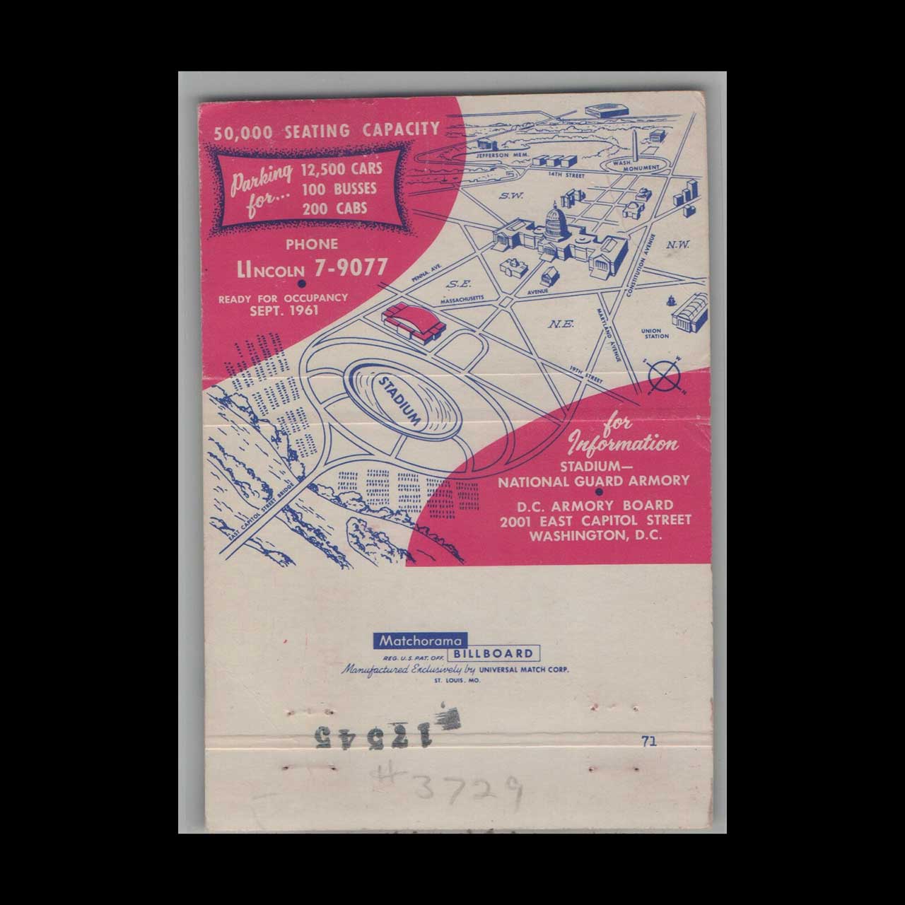 District of Columbia Stadium in Washington DC was a historic sports and event venue. This vintage matchbook is a nostalgic piece of Americana for collectors.