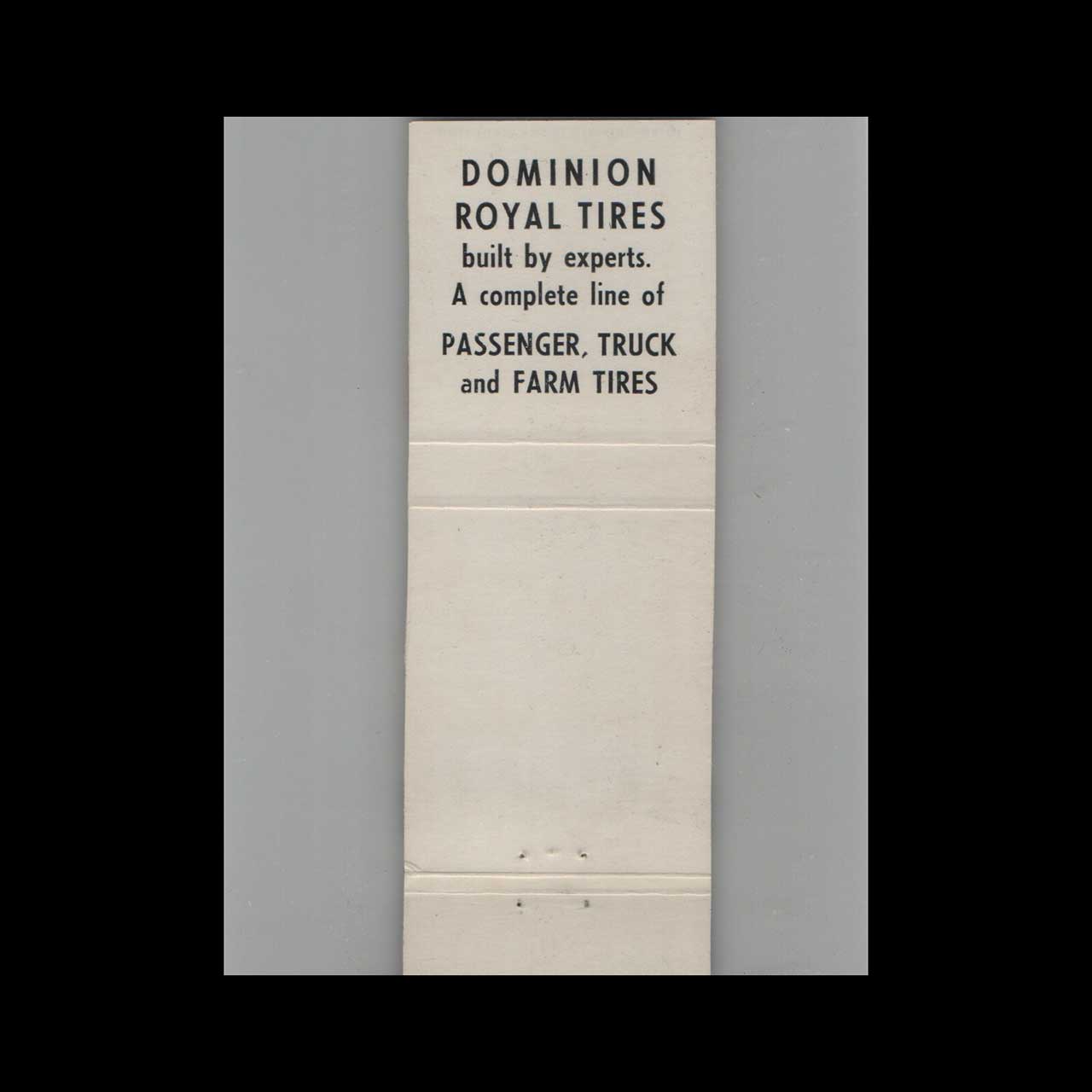 Dominion Royal Tires of Liverpool, NS, a trusted name in automotive care and tire manufacturing. A nostalgic piece of Americana for vintage matchbook collectors.