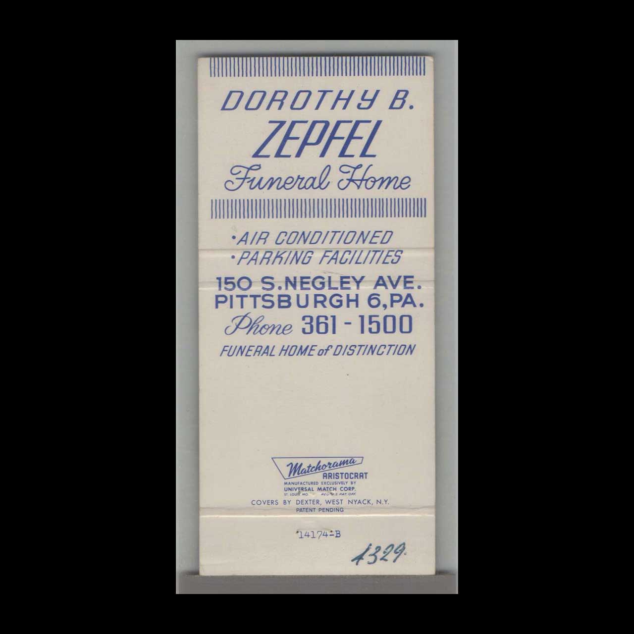 Dorothy B. Zepfel Funeral Home Matchbook Cover Pittsburgh