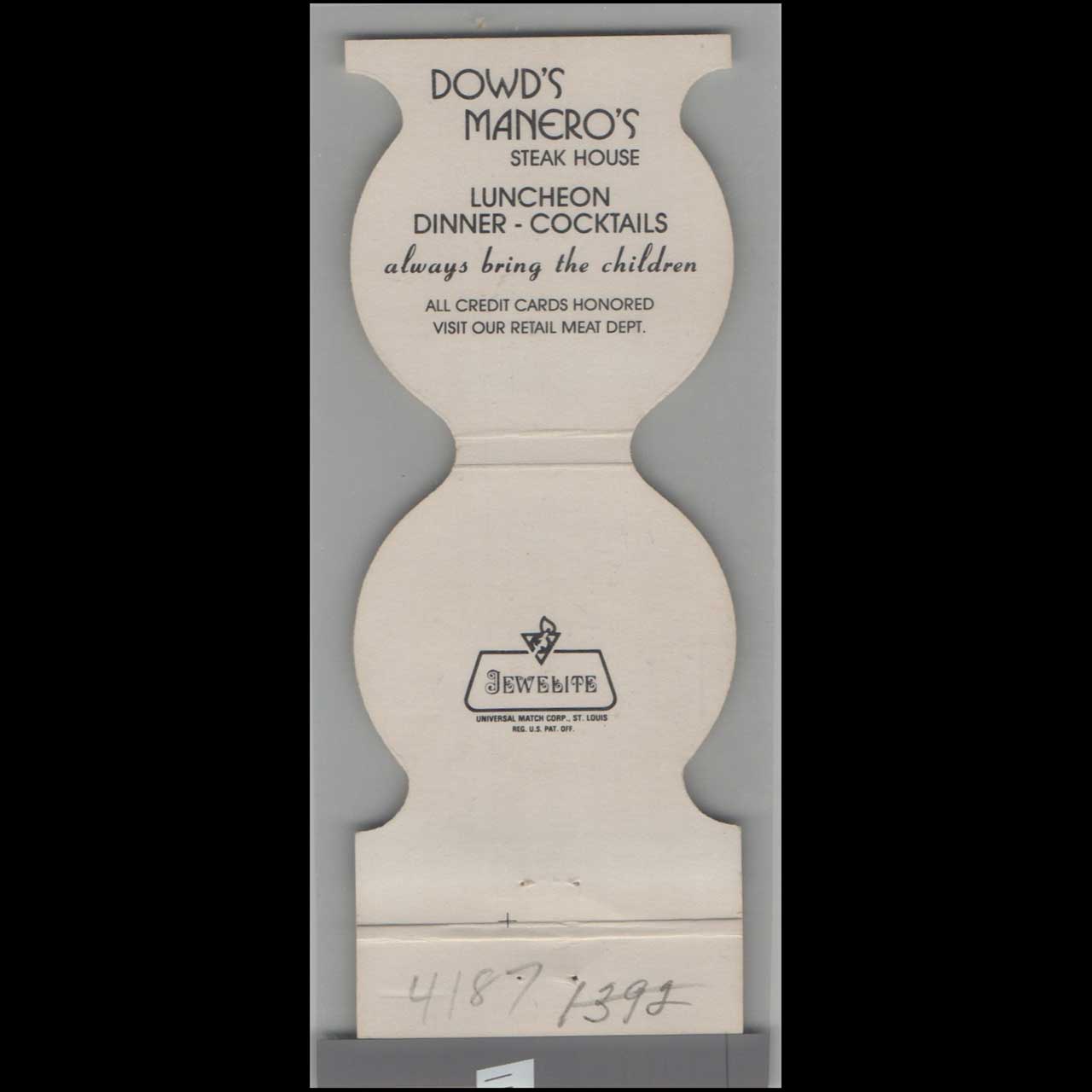 Dowd’s Manero’s Steak House in Garden City, NY, epitomized mid-century American dining with its classic steakhouse charm. This die-cut matchbook cover is a nostalgic piece of Americana for vintage ephemera collectors.