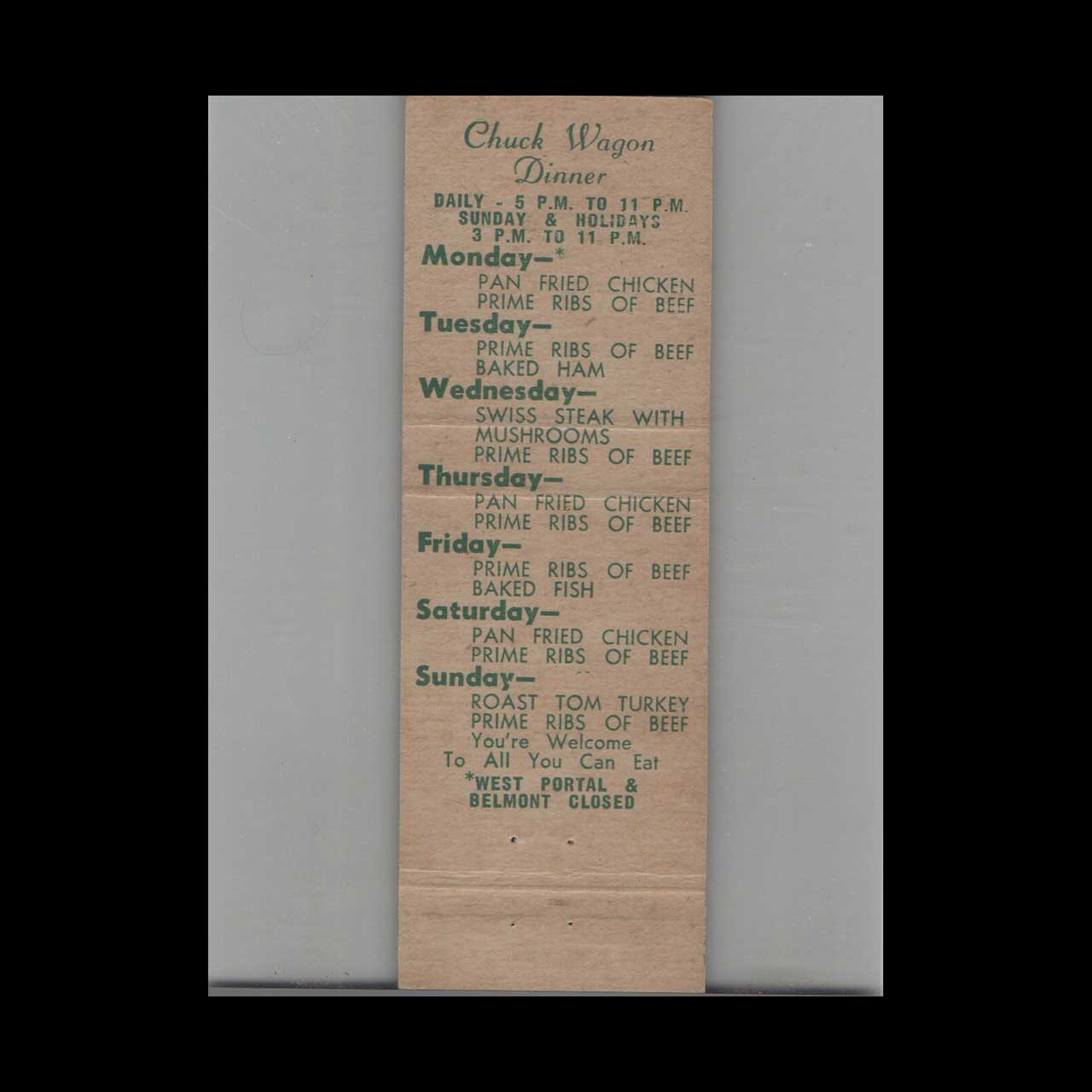 Ed’s Chuck Wagons in San Jose, CA, offered authentic Western-style dining with rustic charm. A classic ephemera relic cherished by Americana collectors.