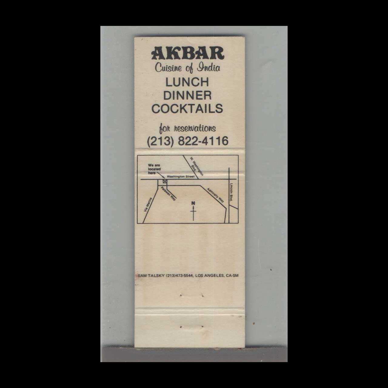 Akbar Cuisine of India in Marina Del Rey, CA, offers authentic Indian dining with a vibrant cultural ambiance. This matchbook is a nostalgic piece of Americana for collectors.