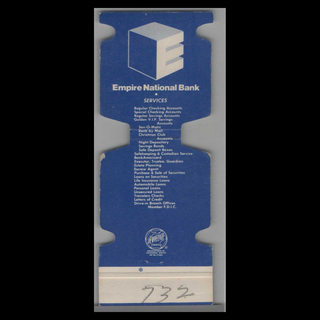 Empire National Bank, a historic financial institution, is captured on this die-cut vintage matchbook cover. A classic ephemera relic cherished by Americana collectors.