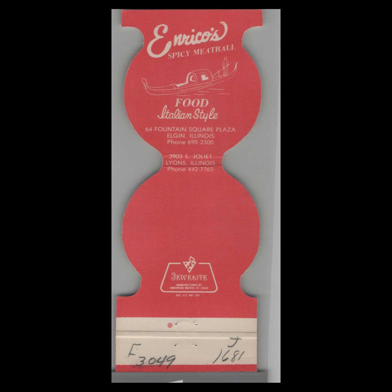Enrico’s Spicy Meatball in Elgin, IL, served authentic Italian flavors with a fiery twist. This die-cut matchbook is a nostalgic piece of Americana for collectors.