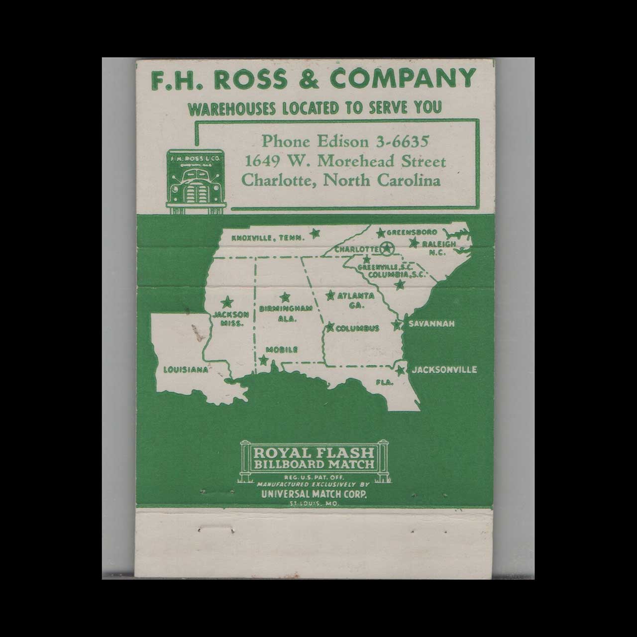 F.H. Ross & Company was a prominent trucking business based in Atlanta, GA, known for its vital role in regional freight transport. This vintage matchbook is a classic ephemera relic, cherished by collectors of Americana.