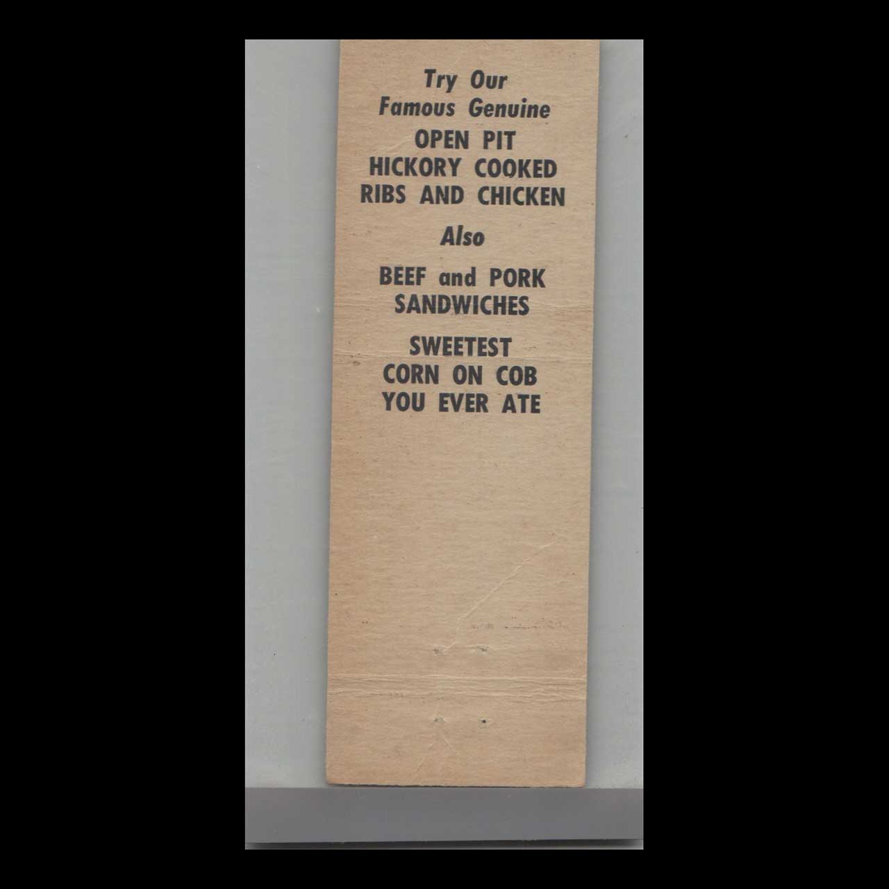 Florida Shorty’s Bar-B-Q Ranch in Miami, FL, served up authentic Southern barbecue in a lively, rustic setting. This vintage matchbook is a nostalgic piece of Americana for collectors.