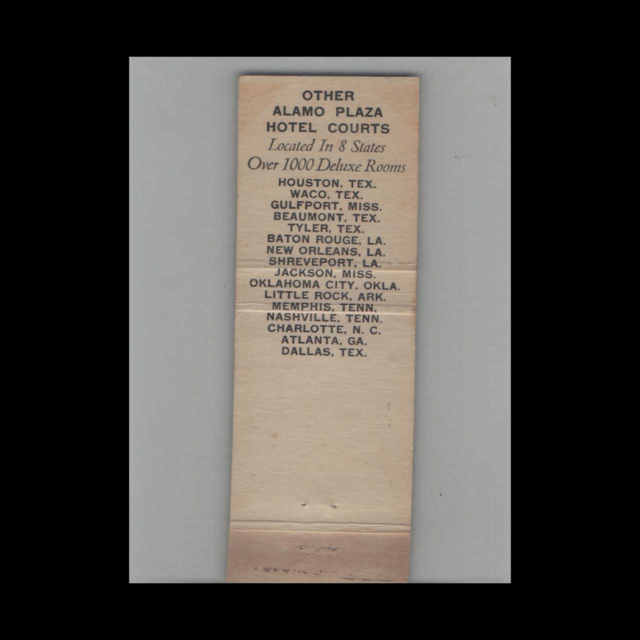 Vintage matchbook cover advertising Full Length Alamo Plaza Hotel Courts Houston TX.