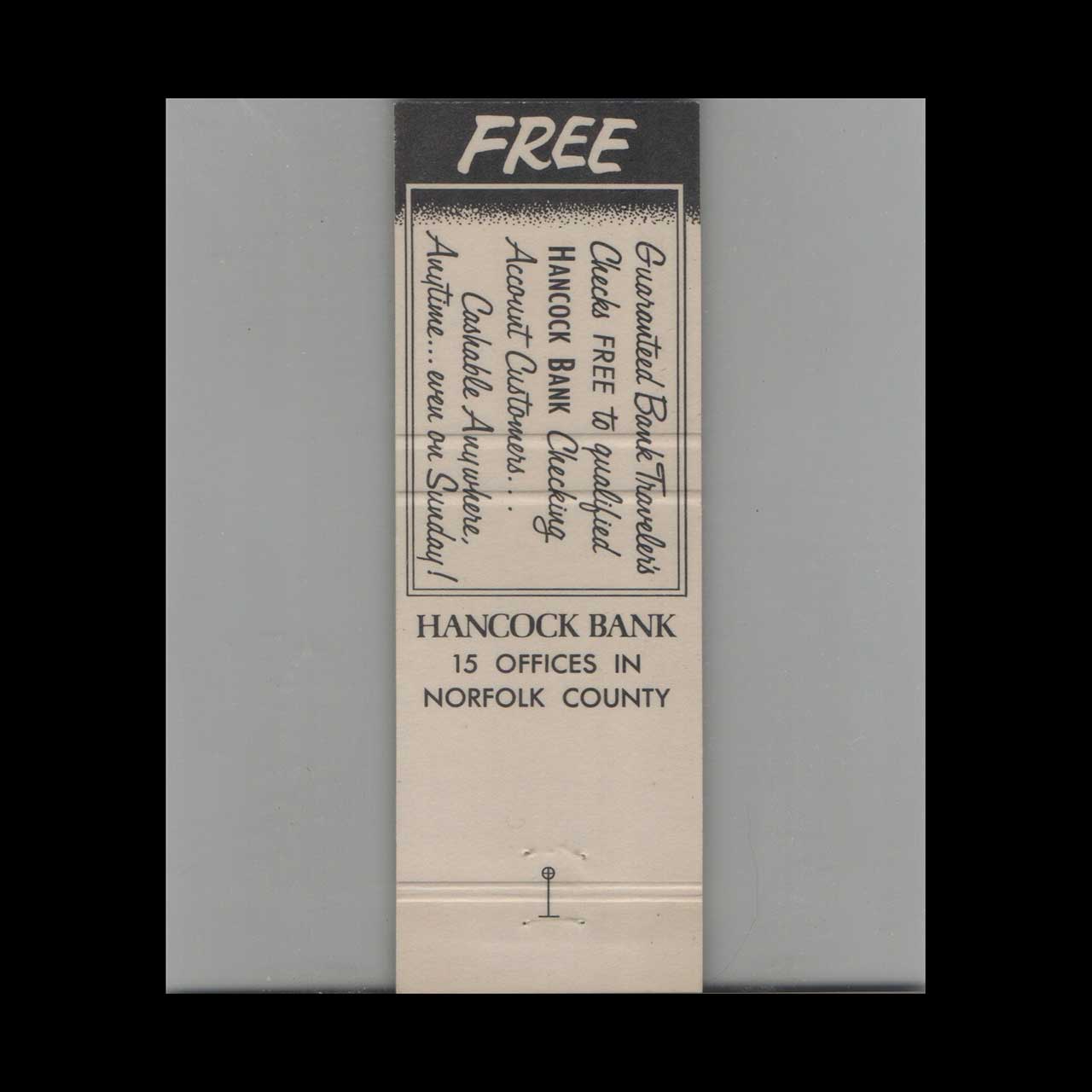 Vintage matchbook cover advertising Full Length Bank Check Hancock Bank Norfolk County.