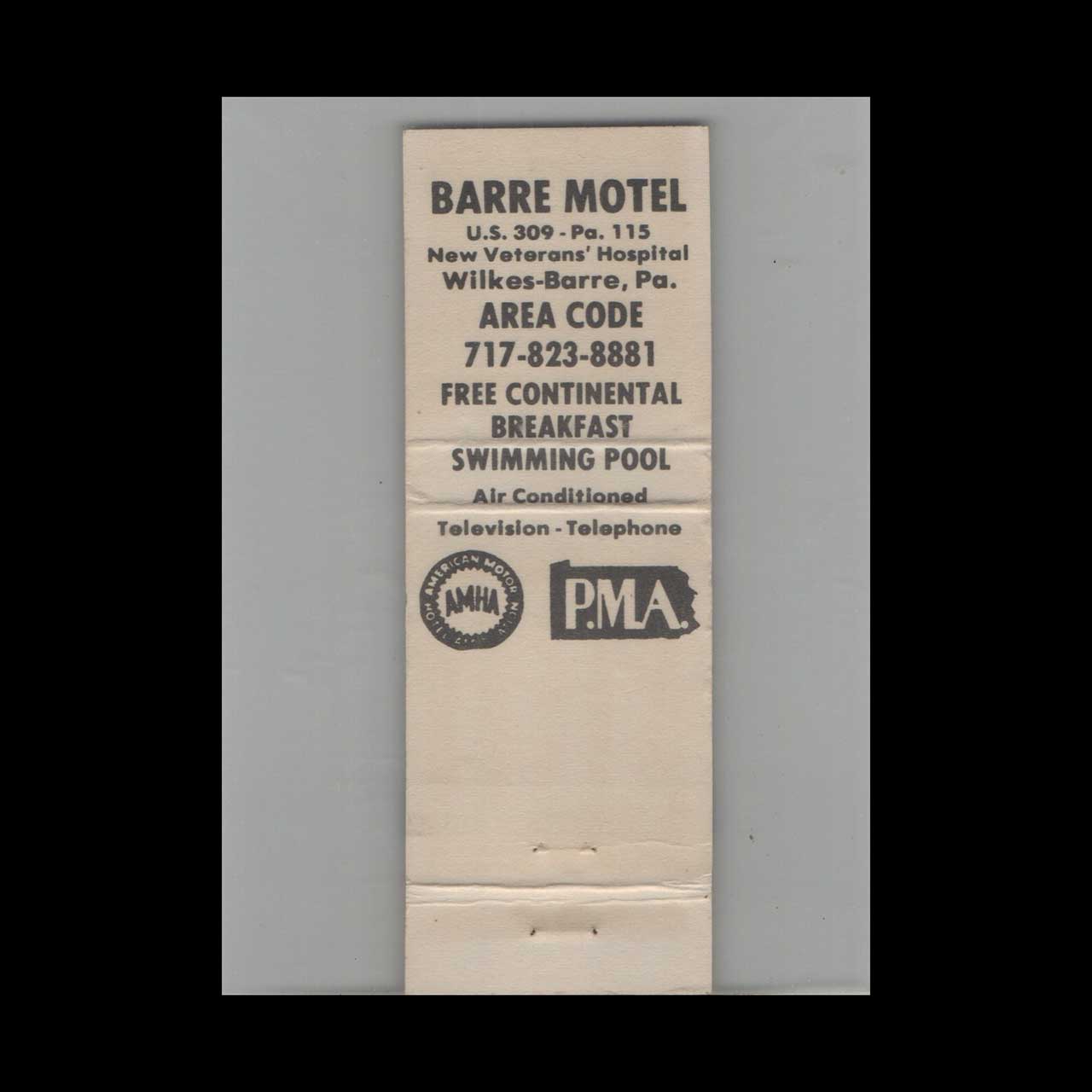 Full Length Matchbook Cover Barre Motel Wilkes Barre PA #1