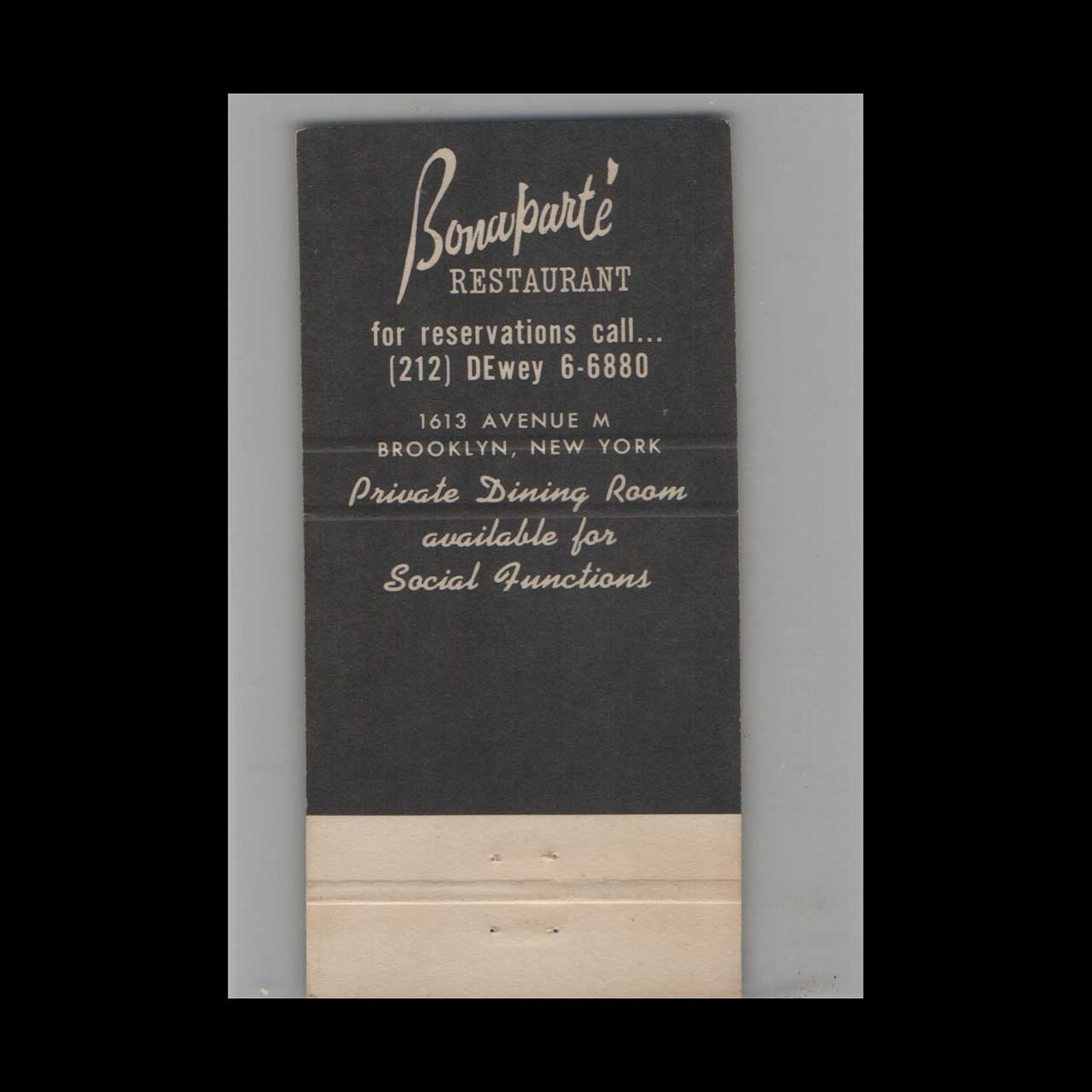 Vintage matchbook cover advertising Full Length Bonaparte Restaurant Brooklyn NY.