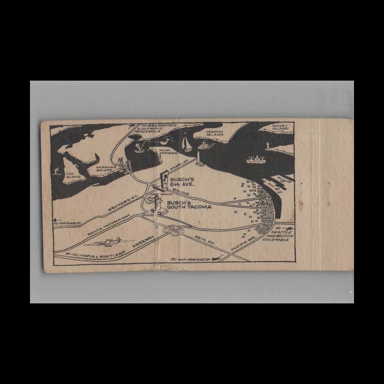 Vintage matchbook cover advertising Full Length Busch’s Restaurants Tacoma WA.