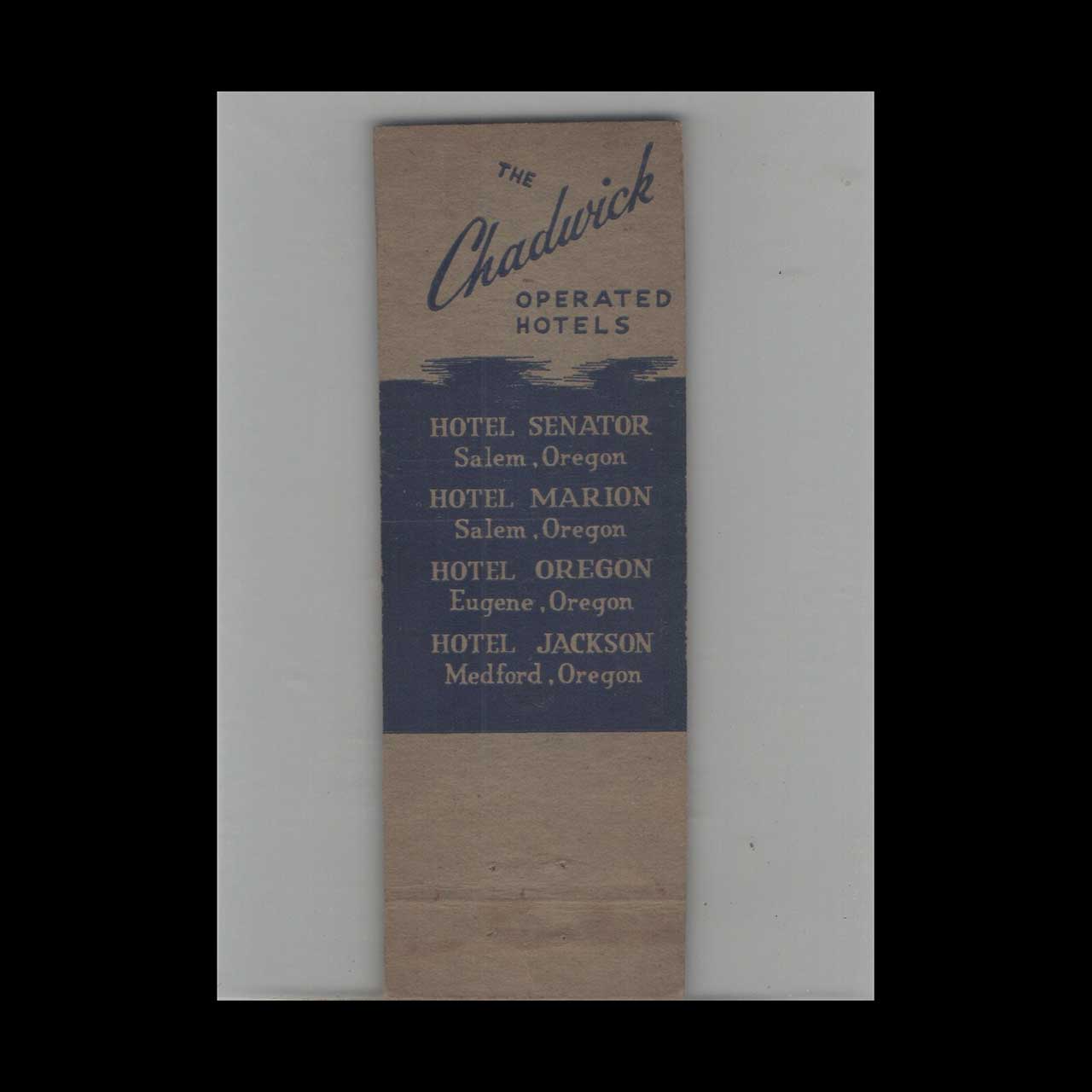 Vintage matchbook cover advertising Full Length Chadwick Operated Hotels Medford OR.