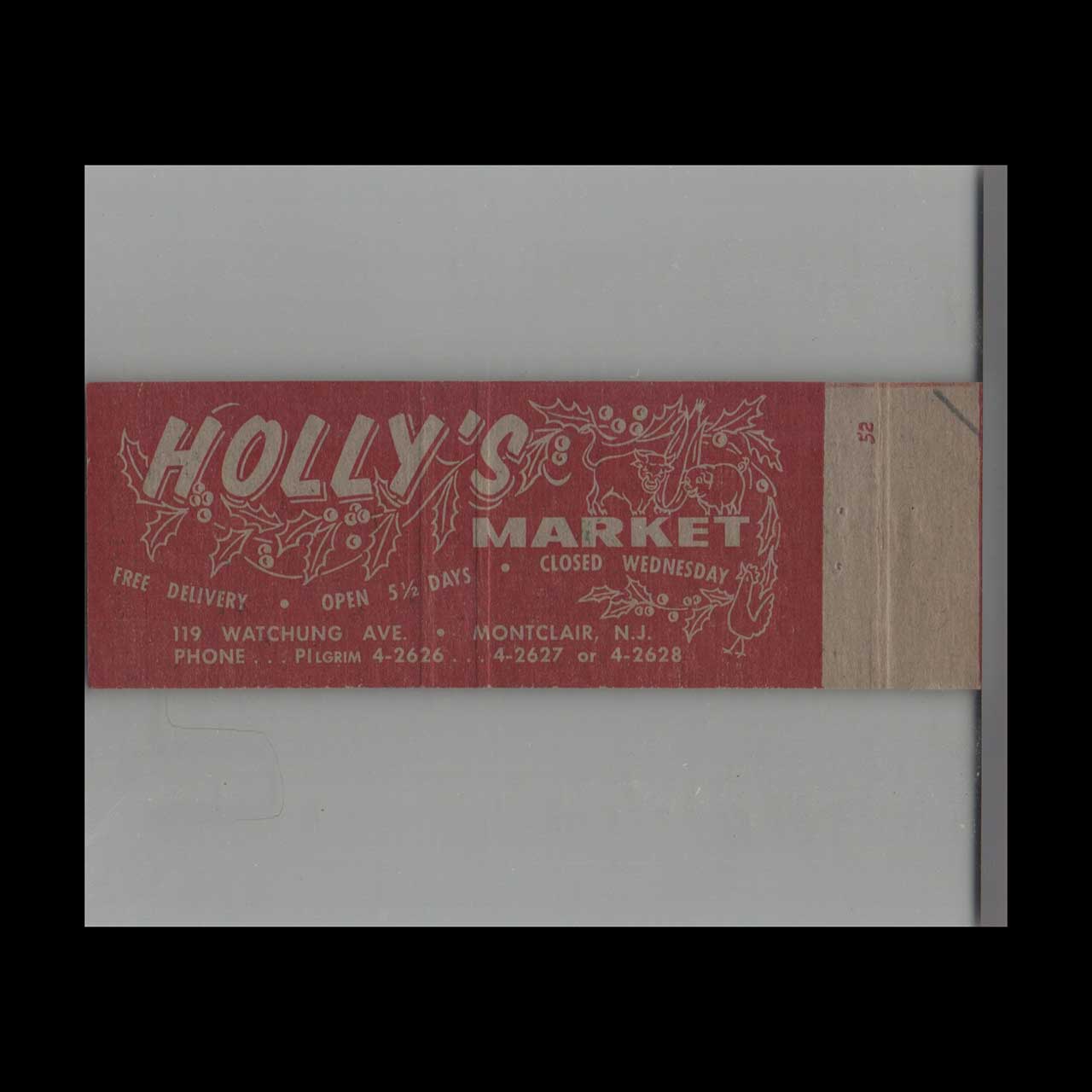 Vintage matchbook cover advertising Full Length Holly’s Market Montclair, NJ.