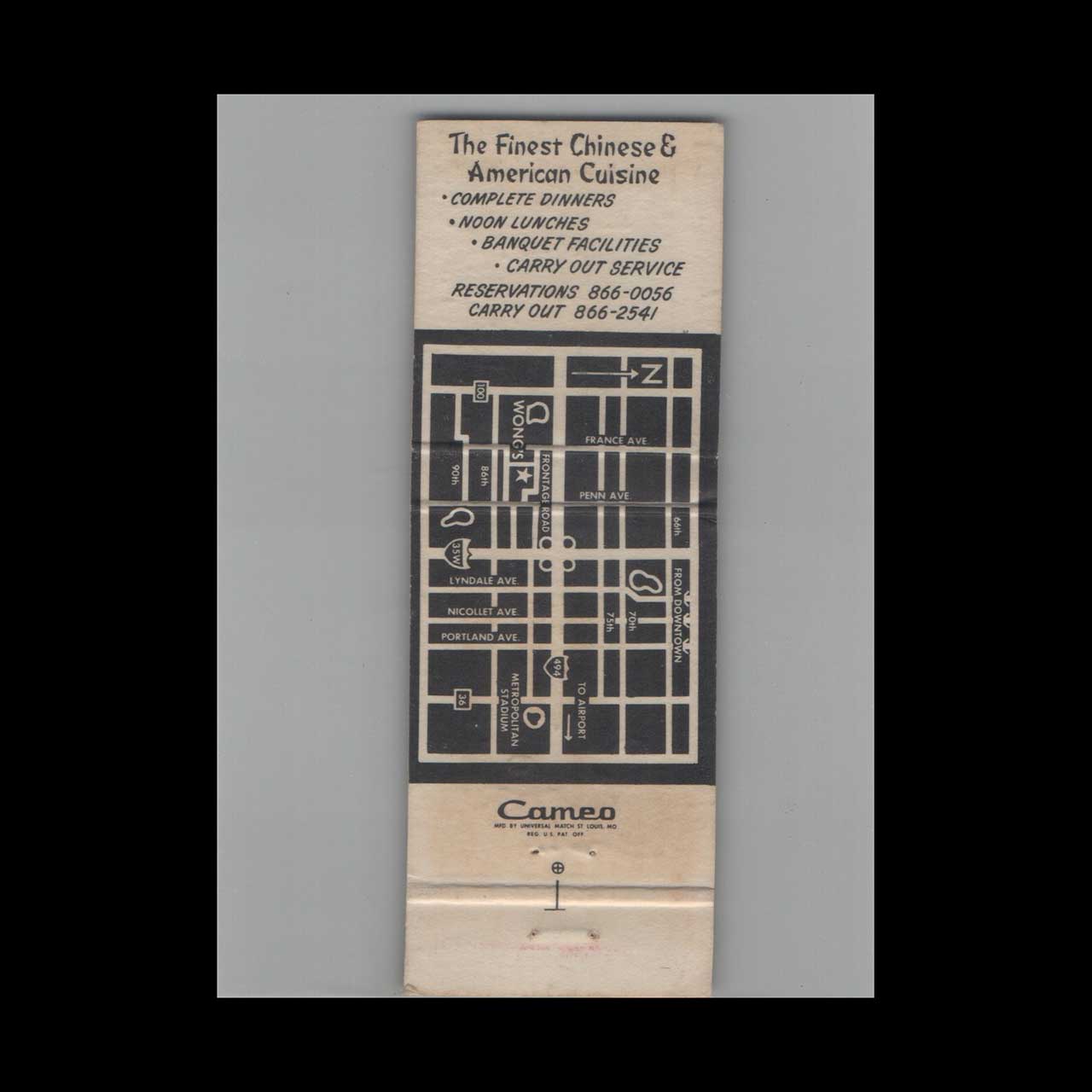 Vintage matchbook cover advertising Full Length Howard Wongs Chinese Foods Bloomington MN.