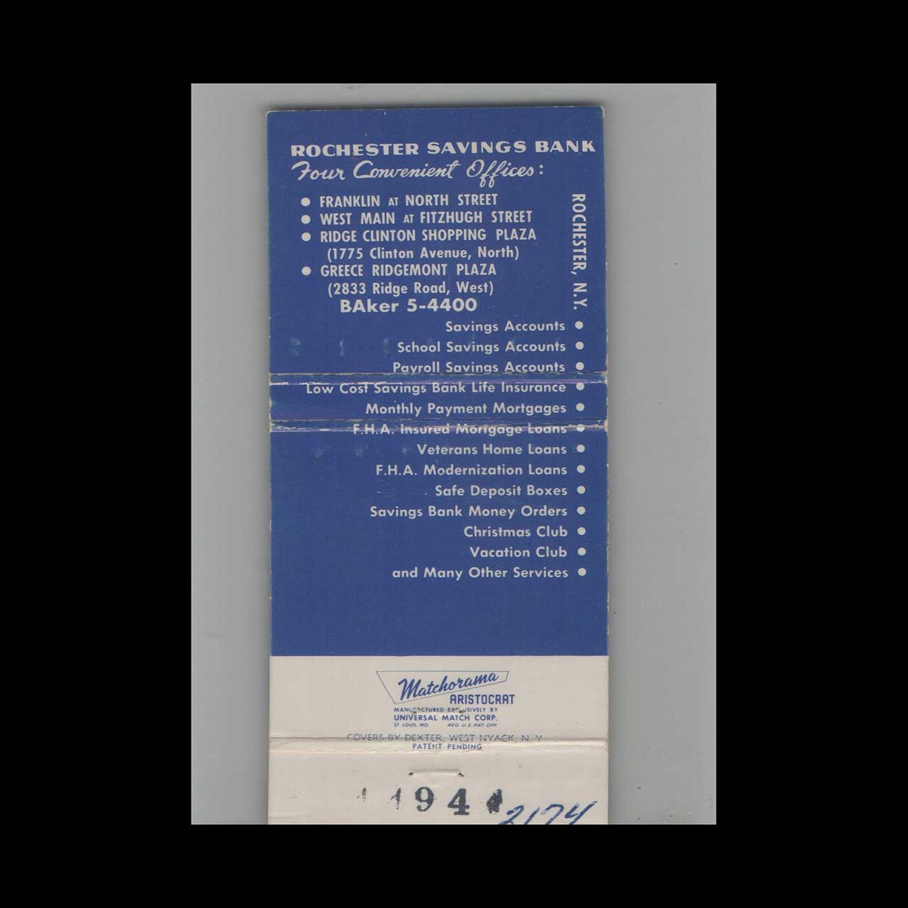 Vintage matchbook cover advertising Full Length Rochester Savings Bank Rochester NY.