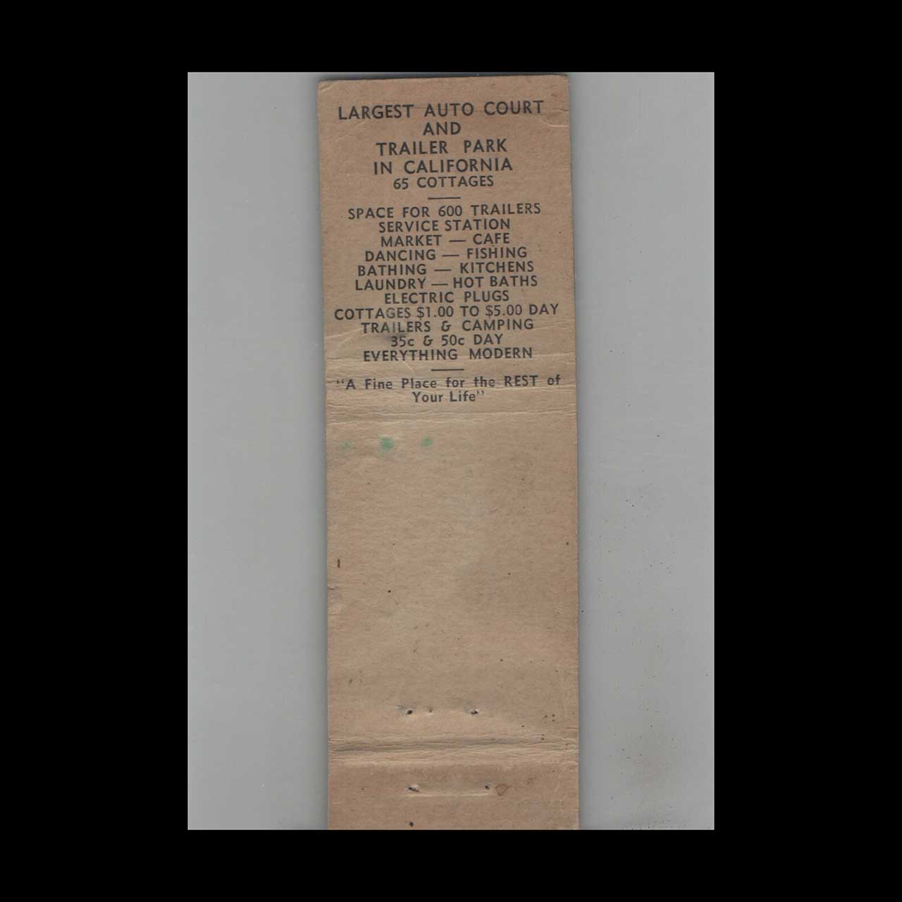 Sea Breeze Auto Court in Huntington Beach, CA, offered classic coastal lodging with nostalgic mid-century charm. This full-length matchbook cover is a rare collectors relic embodying vintage Americana allure.