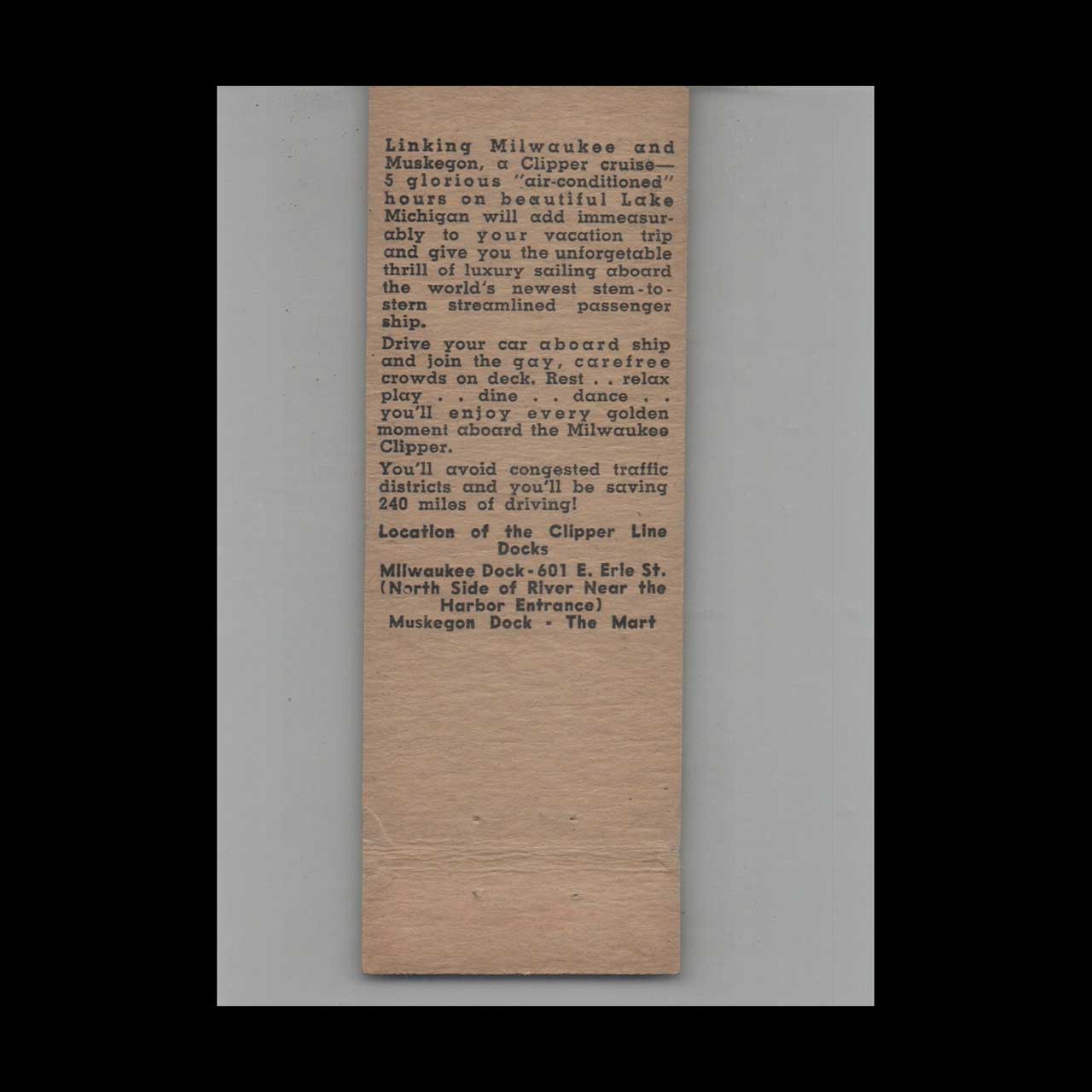 Vintage matchbook cover advertising Full Length SS Milwaukee Clipper Muskegon MI.