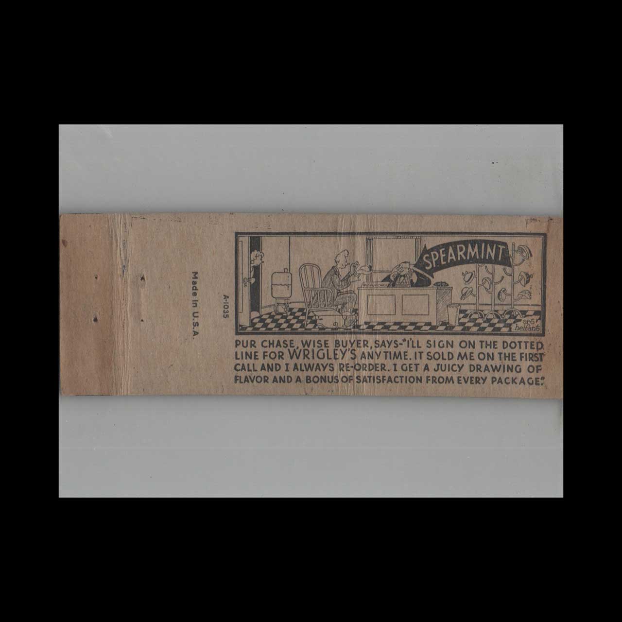 Vintage matchbook cover advertising Full Length Wrigley’s Spearmint Gum Cartoon #8.